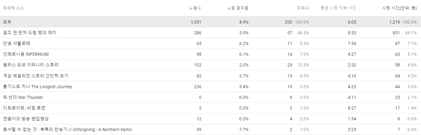 흠.. 아이러니 하게도 제 닉네임인 "앤글"을 검색해서 영상을 보는 경우가 시청시간이 제일 많군요. 거기다가 평균 시청 지속 시간을 보니 대략 31분. 그렇다는건 게임하고 올린 풀 영상을 다 본다는 건데..? 평소에 저를 알기때문에 게임 이름을 검색하지 않고 제 닉네임을 바로 쳐서 들어가는 거겠죠...