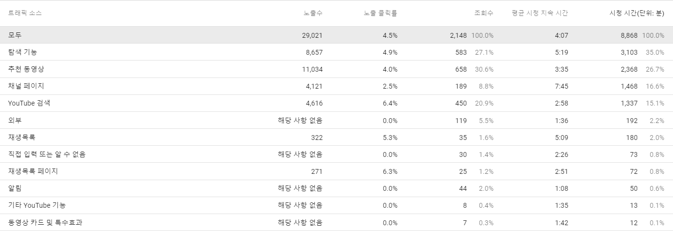 가장 많은건 탐색기능과 추천 동영상. 의외로 유튜브 검색이 압도적이지 않네요. 제 영상은 사람들이 '어떤 영상을 다 보고 난 후 나오는 추천 동영상'을 통해 가장많이 보는군요. 하지만 제가 중요시본건 평균 시청 지속 시간입니다. 제 영상을 본다해도 짧게보면 의미가 없어요. 평균 시청 지속 시간이 가장 많은건 탐색 기능과 채널 페이지...? 채널 페이지가 뭔지는 모르겠지만, 탐색 기능이라면...?