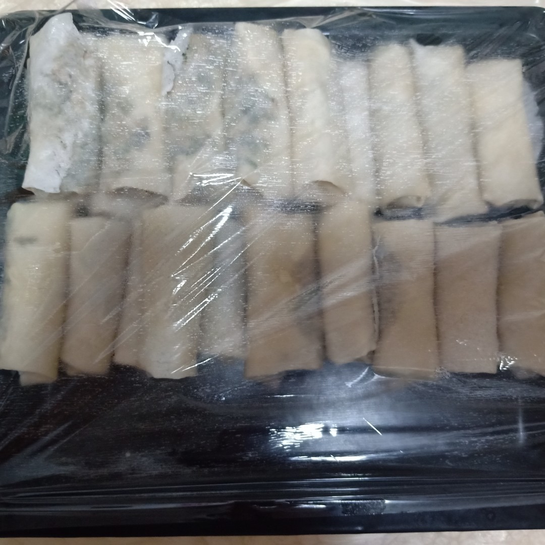 今天从菜市场买来春卷皮,用韭菜,鸡蛋,干子,肉做馅包好春卷放入冰箱。