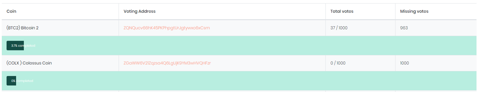 After fill out form with your project, automaticaly the table will update and shows wallet address for vote and evolution bar.