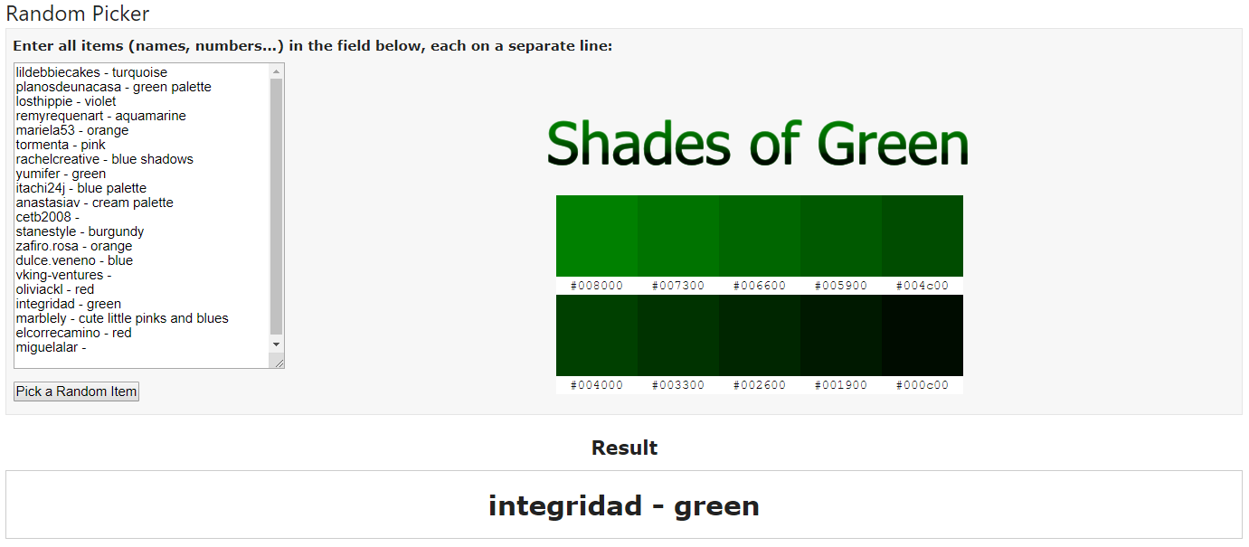 Below is a screen capture of the random picker's selection: (with example shades of the colour)
