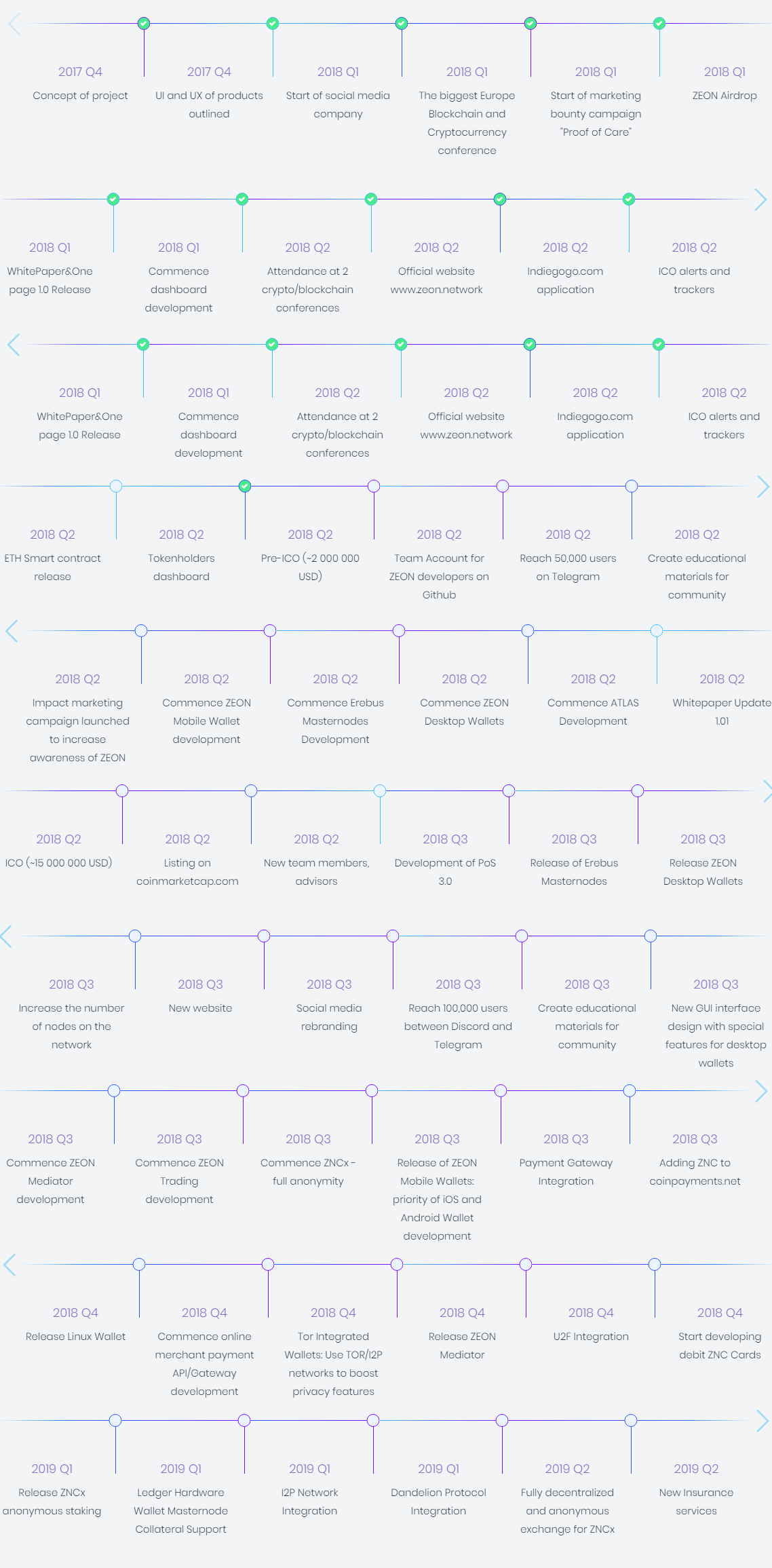 우리의 비영리 조직은 암호 프로젝트의 크라우드 펀딩에 대한 안전한 참여의 미래를위한 기술을 개발할 것입니다. ZEON 디자인의 초석은 네트워크를 작은 조각으로 나눠서 분할하는 것입니다. ZNC는 프로젝트 모니터링을 위해 Oracle을 사용하는 세계 최초의 토큰입니다. 스테이크 3.0의 증명 : 7 레벨을 가지고 있고 우리에게 31000의 이론적 인 Tx / s 스피드를 허용하는 스테이징을 가진 masternode Erebus.