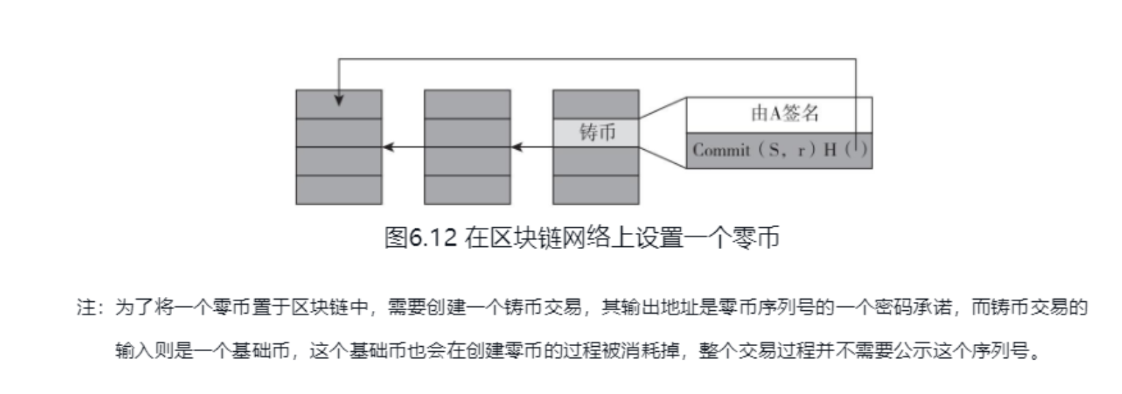 As shown in the figure below, publishing the promise on the blockchain requires the consumption of a base coin, which can no longer be spent, thus creating a zero coin. At this time, S SS and r rr are still confidential.