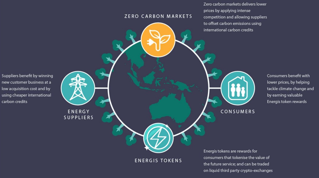 Авторы проекта Zero Carbon для доступности рынка возобновляемых источников энергии создают платформы, где поставщики экологически чистой энергии могут размещать свои предложения. Предлагаются технологии блокчейна для прозрачности и конкуренции между поставщиками для потребителей рынка, для поиска оптимальных вариантов. Возможно заключение партнерских соглашений с выбранным поставщиком через смарт-контракты. Устанавливается прямая связь между клиентами на высоком уровне доверия, благодаря использованию блокчейна в рамках единой платформы. Поощрение токеном Energis потребителей, принимающих меры для борьбы с климатическими изменениями.