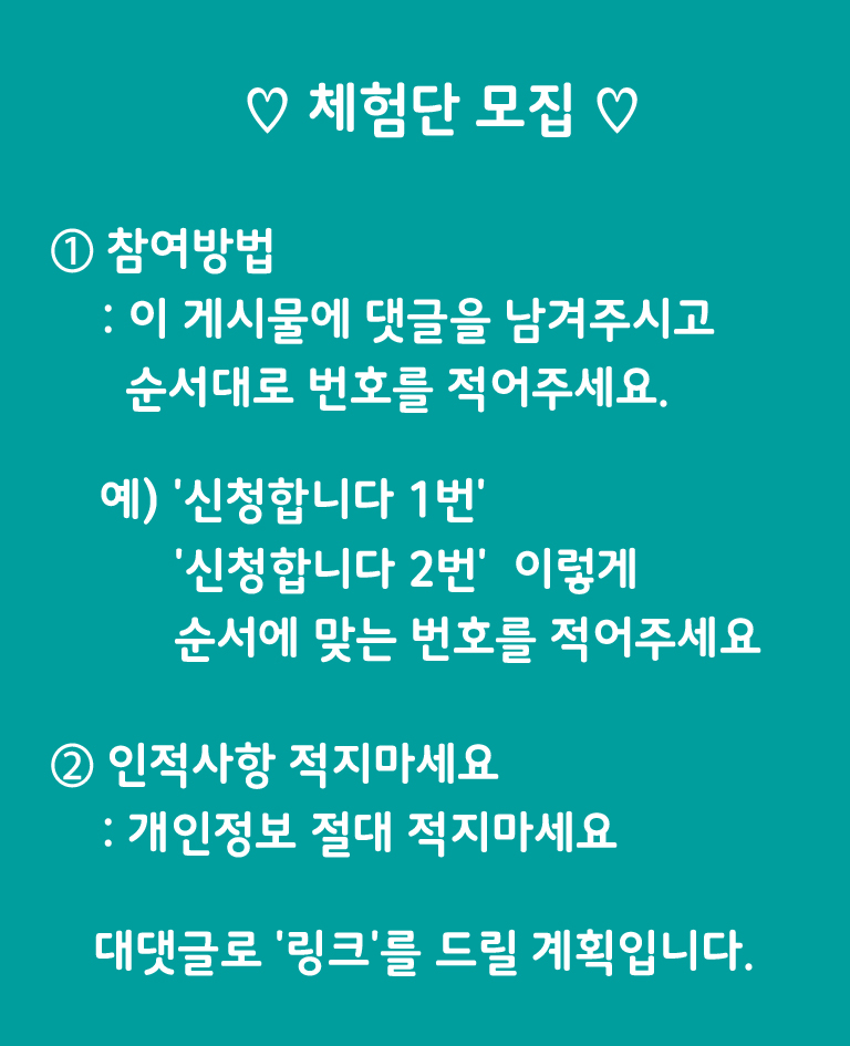 glorye님 오랜만에 뵈어요! 신청해주셔서 감사합니다 아래 링크에 배송지를 남겨주세요 http://naver.me/FtvnYNxp
