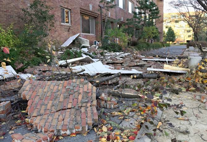 공사장 밖으로 나가면 담장이나 유리창이 깨져 다칠 수 있으니 공사장과 담장에서 최대한 멀리 떨어져 살며 가방이나 손으로 머리를 보호하고 대피한다. 넘어질 것이 없는 공터나 공원.