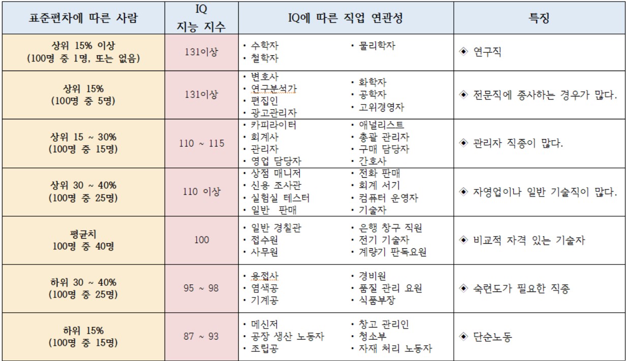 위의 표는IQ에 따른 인구 분포에 대한 단순화와 직업 연관성, 그리고 특징을 나열한 것입니다.