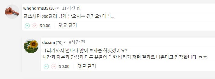 어제 글에 @whqhdrms35 님이 "글쓰시면 200달러 넘게 받으시는 건가요? 대박..."