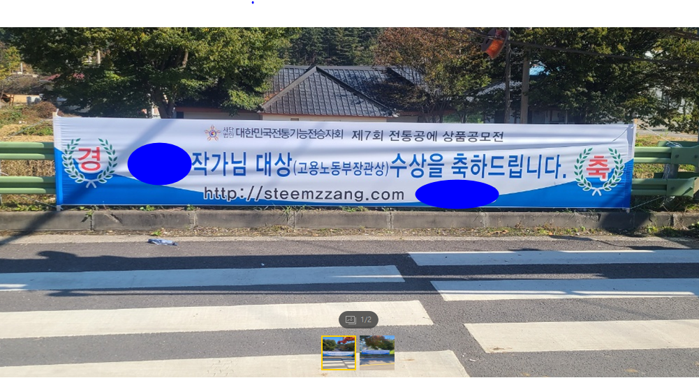사실 친구의 이번 수상은 개인의 영광이기도 하지만 우리 동네 영광도 되고, 지역의 영광도 되는지라 이 기쁨 함께 하고자 우리 동네 마을회관에도 큰 길가 버스 정류장에도 그리고 면사무소와 군청 입구 현수막 거치대에도 수상을 축하한다는 현수막을 업체에 제작을 의뢰해서 폼나게 걸었습니다.
