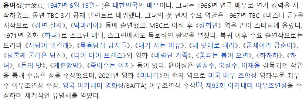 오스카 상을 받은 윤여정의 관련 내용은 신동아 기사에 자세하게 나와있다.