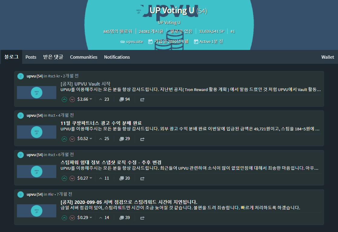 그러다 한 열흘 전쯤부터 한국의 개발진들이 만들어 론칭하여 잘 운영하고 있는 upvu 보팅 프로젝트에 참여를 하였습니다.