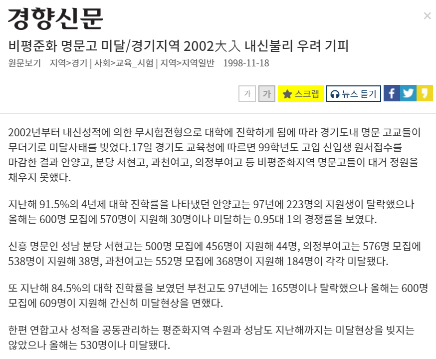 1990년대 말 고입 분위기를 전하는 경향신문 1998년 11월 18일자 기사 기사링크