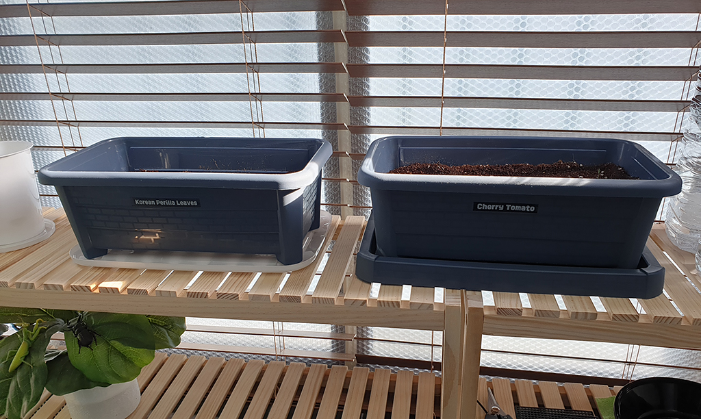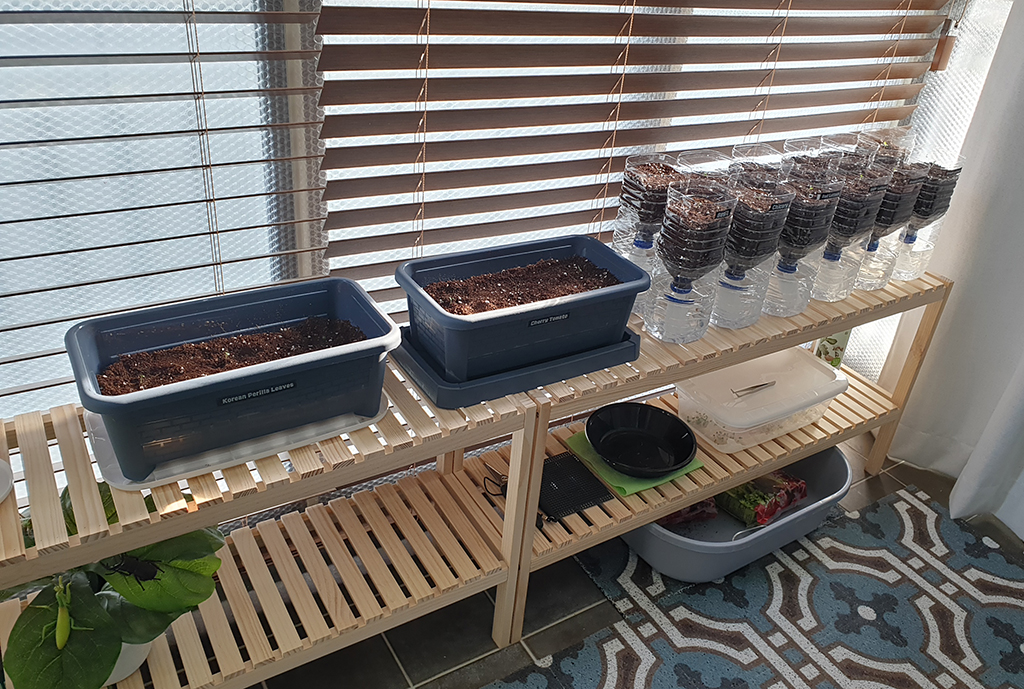 이제 빈틈없이 다 자리를 잡았고 왼쪽에 딸기 하나만 놓으면 끝입니다.ㅎㅎ 딸기는 무조건 모종으로... 파도 키워야 하는데 그건 냄새때문에 반대편 베란다에 따로 놓으려구요. 상추랑 깻잎 많이 자라면 고기파티해야지~!!