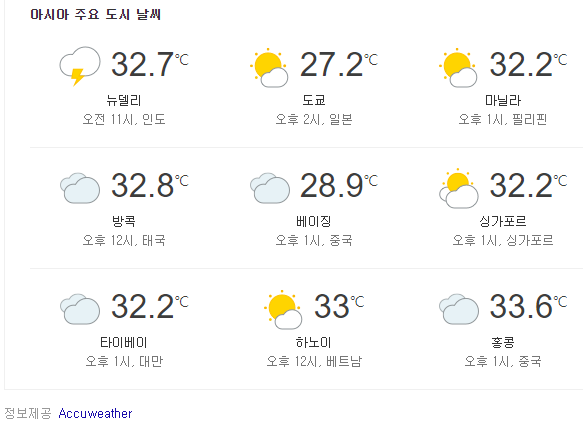 - 현재 아시아에서 온도가 가장 높은 곳은 홍콩 입니다. (33.6도)