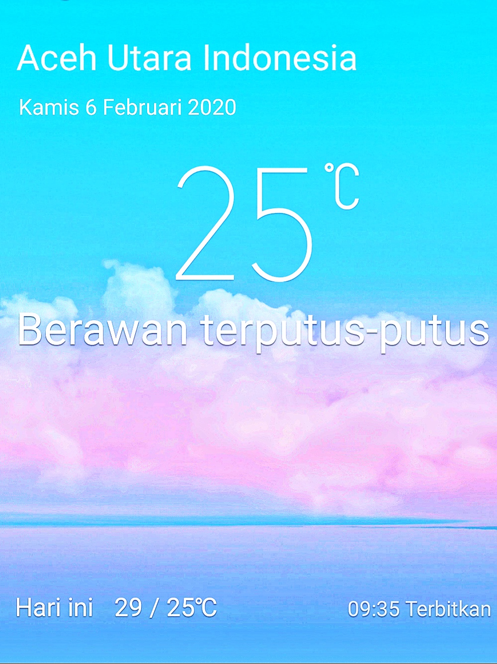 Hallo sahabat semuanya, dari Aceh Utara Indonesia kami kembali menginformasikan suasana cuaca hari ini bertepatan dengan hari Kamis tanggal 6 Februari 2020. Suasana cuaca pagi dalam keadaan cerah berawan dengan suhu berkisar lebih kurang 25 derajat celcius, cuaca seperti sangat mendukung bagi kalian yang berada di seputaran Aceh Utara Indonesia untuk melakukan berbagai macam aktivitas.