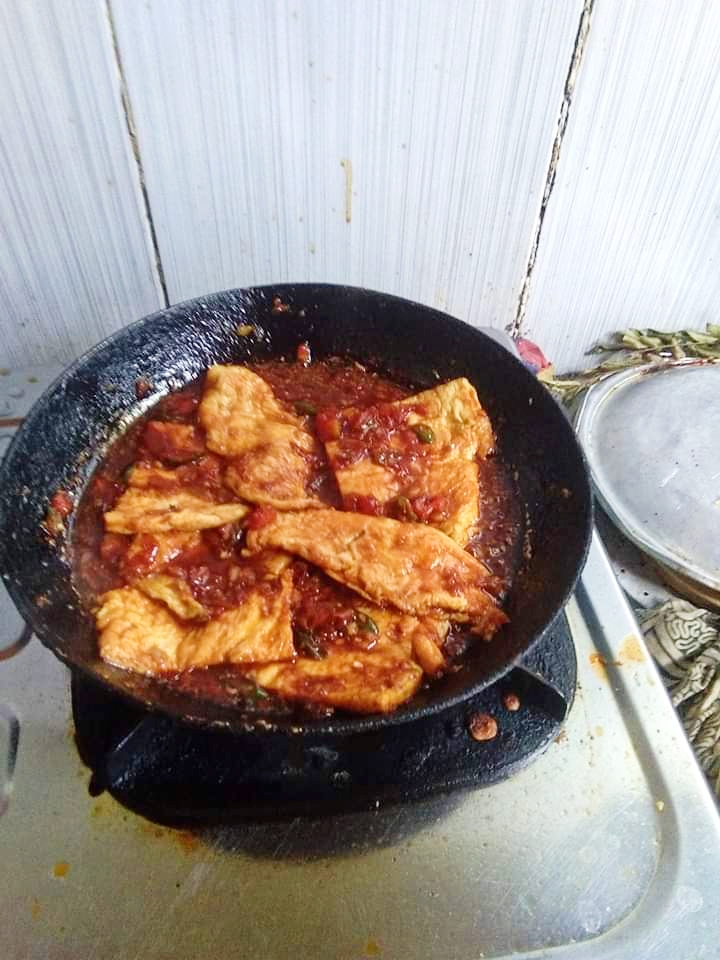 Ini adalah telur dadar sambal kecap. Telur dadar nya di bumbui dan di goreng dengan sedikit minyak, kemudian kita masukkan ke dalam sambal pedas, yang sudah di campur kecap manis.