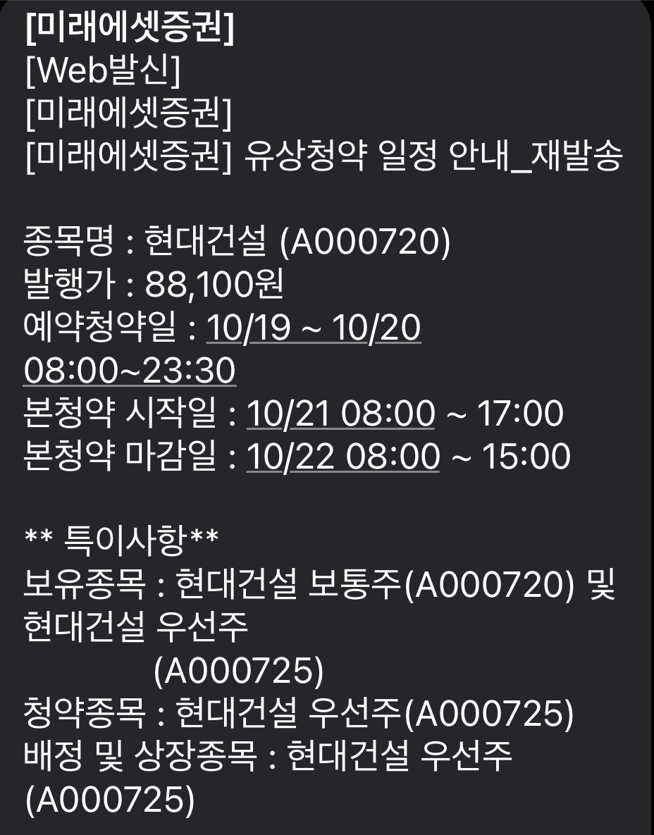 현재상황 현대건설우 주가가 떨어진 상황이라 11월5일 상장날 상황이 나쁘지 않기를 기대해본다
