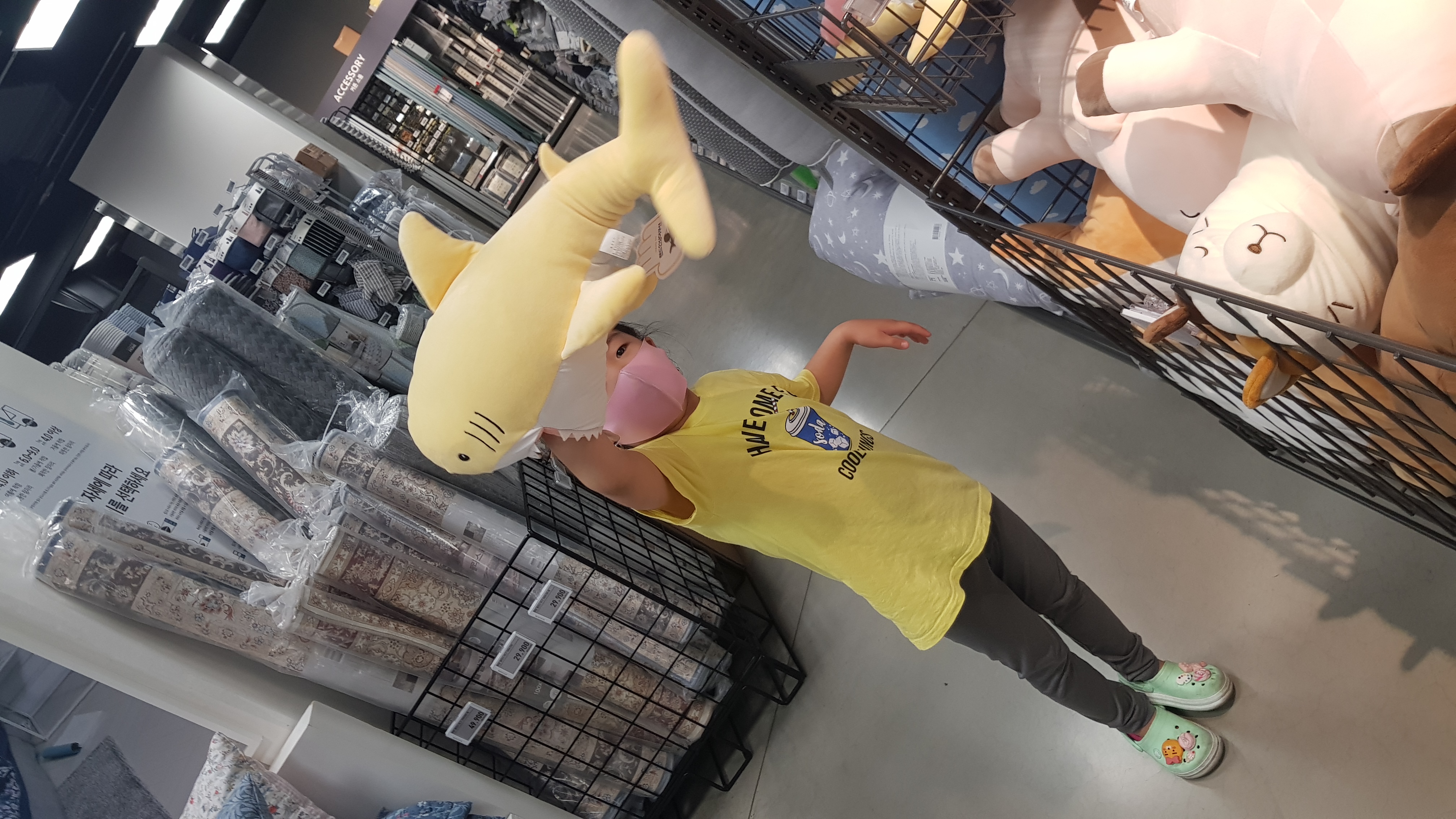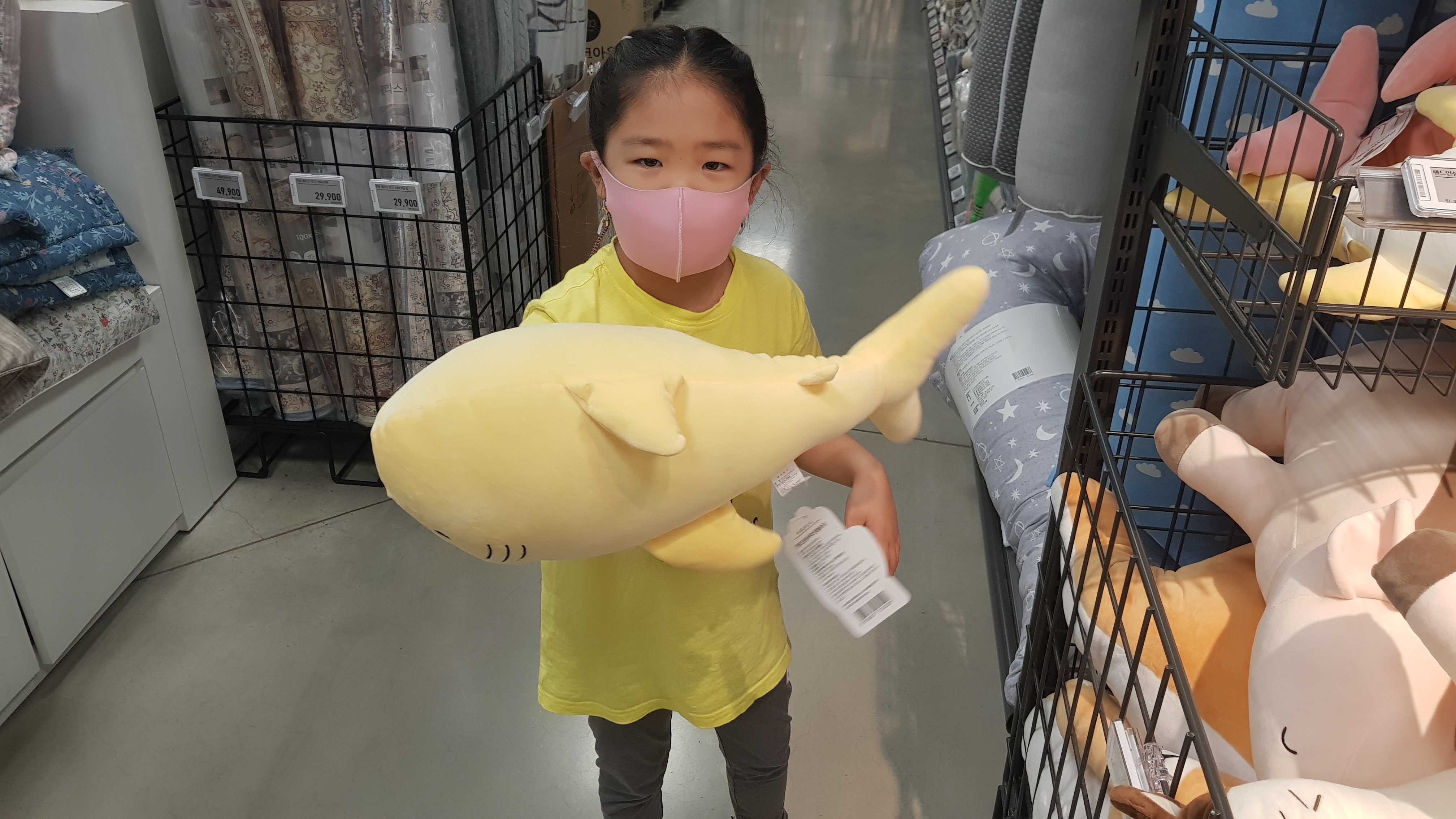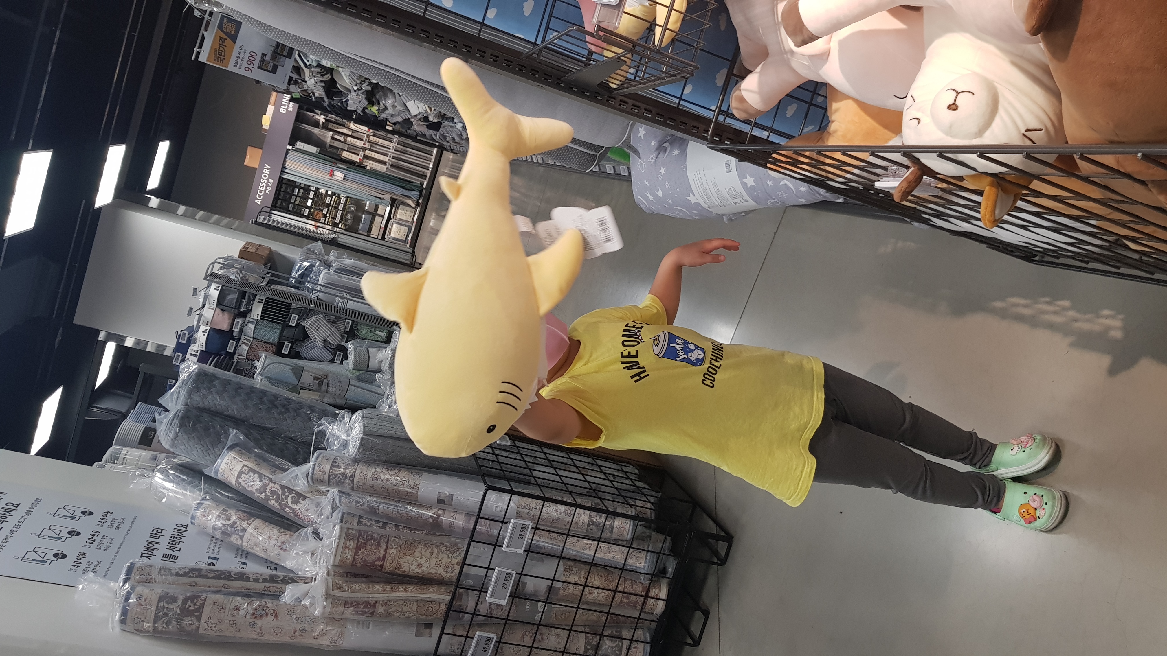아이가 침구류가 있는 코너에 있는 상어에 관심을 가지더라구요