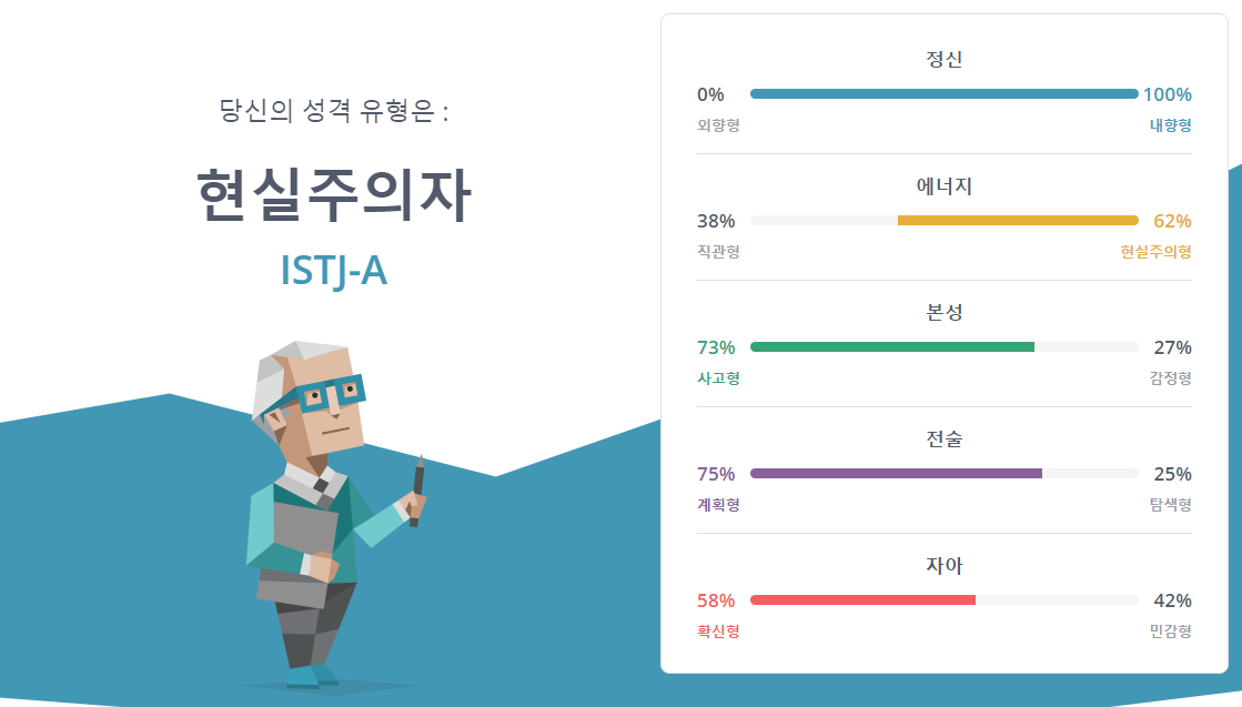 이제 앞으로 누군가 MBTI 물어보면 ISTJ-A 라고 대답해 줄 수 있을거 같습니다.