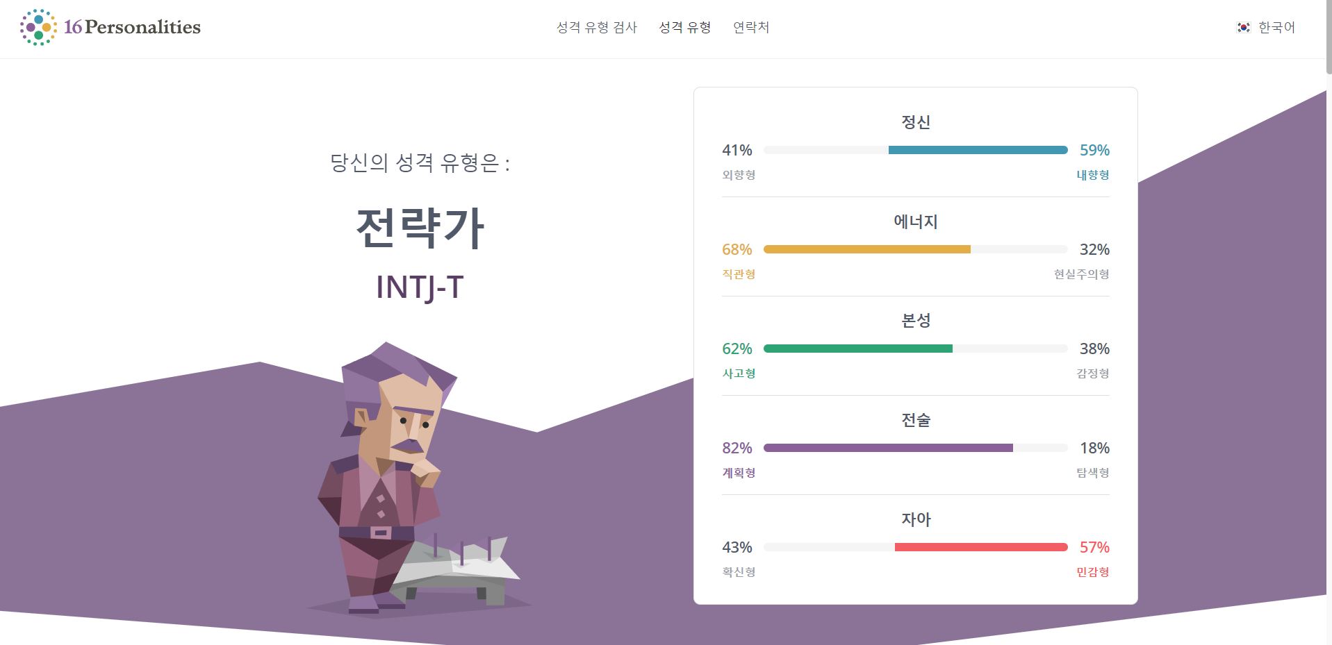 지금 해보니 INTJ-T 전략가가 나오네요 ㅎ