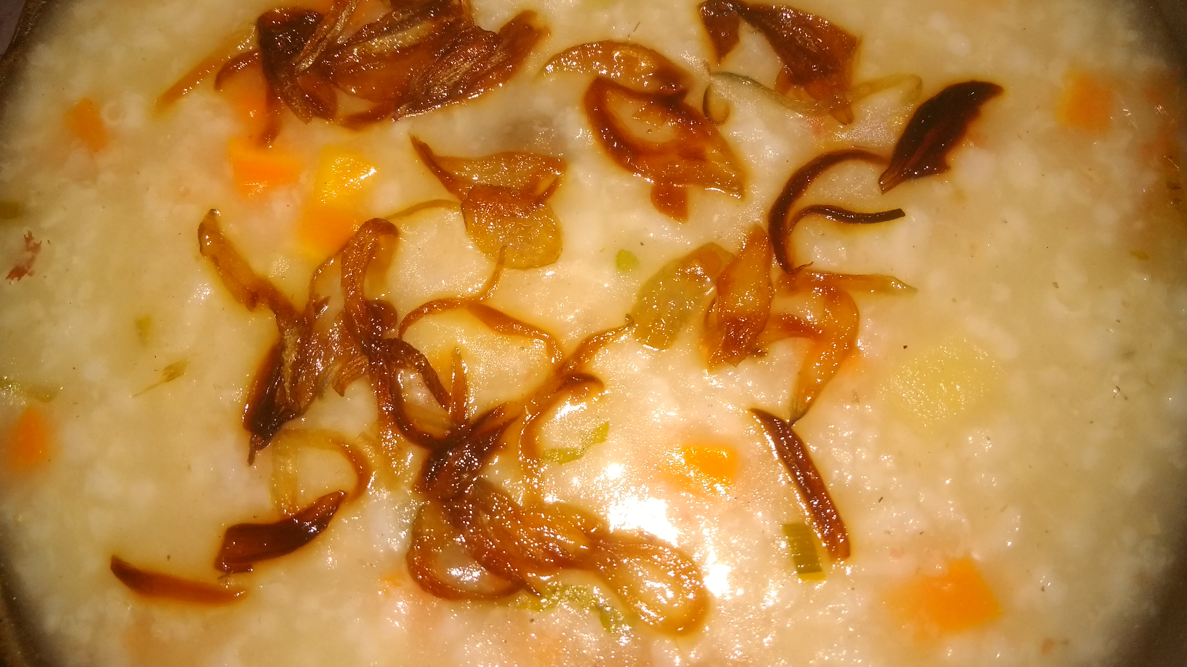 Setiap makanan memiliki ciri khas tersendiri seperti bubur kanji ini. Biasanya bubur kanji ini menemani orang berbuka puasa di bulan ramadhan. Rasa bawang goreng akan sangat terasa karena ditaburi diatasnya.