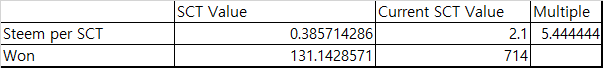 이건 이전 포스팅에서도 썼었는데, 아직도 유효한건지는 모르겠으나... 1 SCTM = 3 STEEMP = 2 SCT 이니깐. 1.5 Steem = 1 sct 라는 기적의 계산법이 나온다.