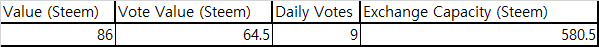 위 표를 보면, 1회당 보팅은 86스팀 찍을 수 있는데, 큐레이션 수익을 빼고나면 사실상 64.5 스팀을 찍는 것 이다. 이걸 대충 하루에 9 번 하니깐 (소숫점 아래 버렸음) , 총 보터가 환전 시킬 수 있는 스팀 액수는 580 스팀이다. 즉, 580 스팀 어치의 SCT 를 환전 시킬 수 있는 것.