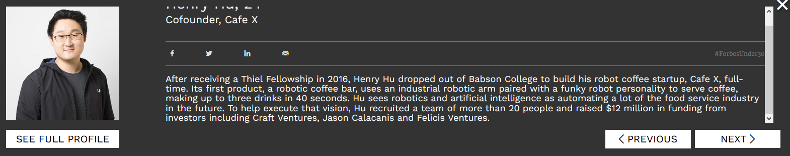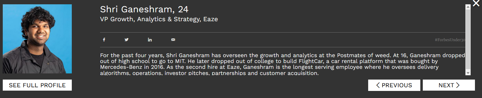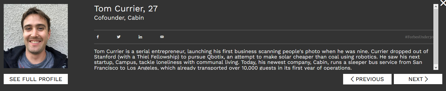 ㅋㅋㅋㅋㅋㅋㅋㅋㅋㅋㅋㅋㅋㅋㅋㅋㅋㅋㅋㅋㅋㅋ 웃음밖에 안나온다. 9 살때 사람들의 사진을 스캐닝하는 비즈니스를 만들었고, 스탠포드 중퇴. Another Drop out ㅋㅋㅋㅋㅋ 샌프란시스코 부터 LA 까지 잠자는 버스를 운영한다고 한다.