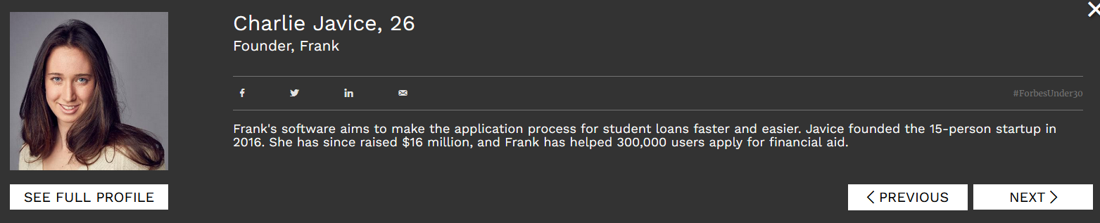 학자금 대출을 쉽게 받을 수 있는 소프트 웨어를 개발하여, (양식에 필수 정보 같은거 준비하라고 알려주는 듯) 현재까지 30만명 정도가 이용했다고 한다. 음... 근데 수익 모델이 잘 안보인다. 느낌상 은행한테 받을 거 같은데