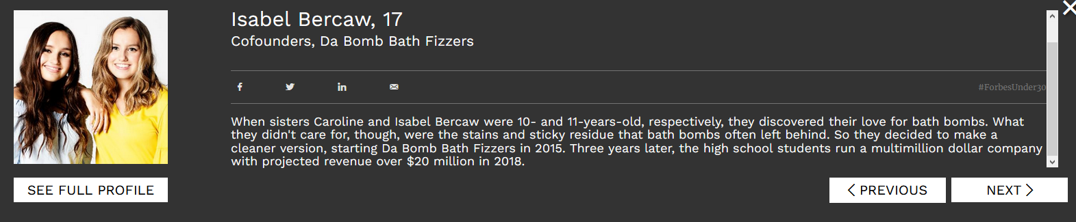 ㅋㅋㅋㅋㅋㅋㅋㅋ 16살 17살 자매가 경영하는 회사로, 10/11살에 목욕밤? (목욕물에 풀으면 이쁘게 거품나는거!) 을 너무 좋아해서 사용을 했는데, 다 사용하고 물을 뺐을때 찌꺼기가 남아서 싫었다고 한다. 그래서 자매가 직접 깨끗한 목욕밤을 만들기로 했던것! 현재 고등학생인데, 이미 multimillion dollar comapny ㅋㅋㅋㅋ 18년도 매출이 20m