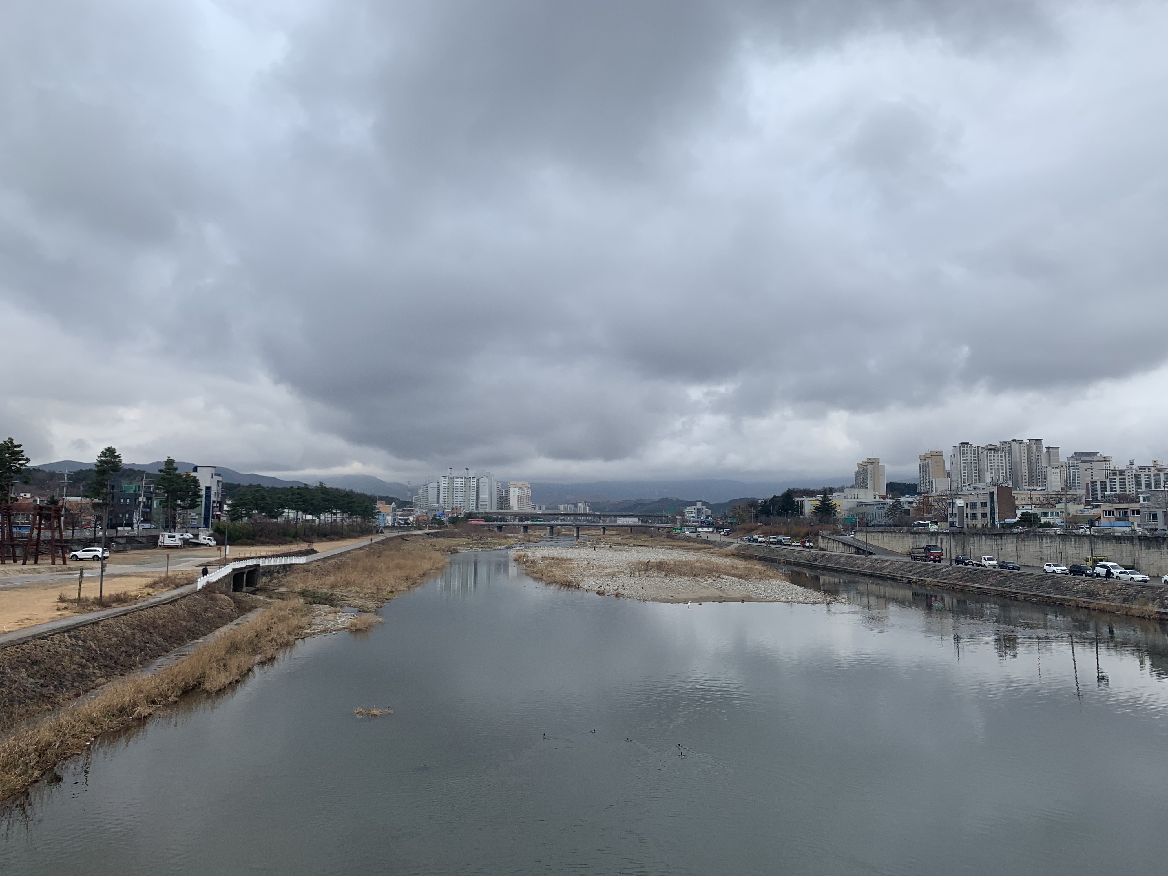 맛있게 배를 채우고 난 후 오늘은 차를 쓸 수 없는 불편한 날이기에 밖에 나갈 준비를 하고 걸어서 여권사진을 찍으러 나갔다. 평소 같았으면 후다닥 갔을 그 평범한 길을 나는 포스팅을 위해 휴대폰을 들고 주위 사진을 찍기 시작했다. 다리를 반쯤 건넜을 때, 오리가 눈에 보였다. 열심히 잠수를 하며 먹이를 찾고 있었고 수영을 하며 배설을 하는 찰나의 순간을 나에게 찍혔다.