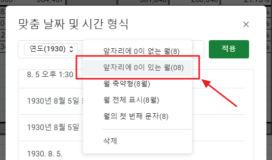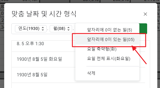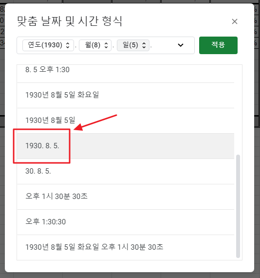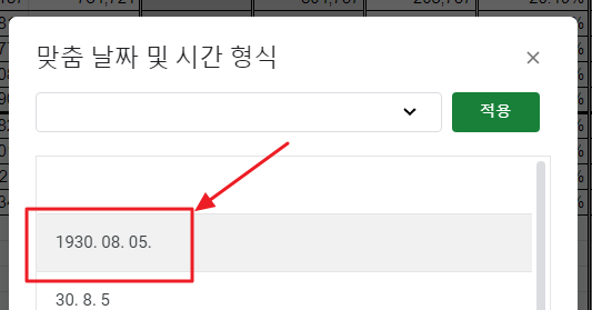 하지만, 아무리 찾아 보아도 원하는 형식을 찾을수 없을 것이다. 그러니 일단 가장 비슷한 형태인 "1930. 8. 5" 로 표시된 형식을 선택하자.