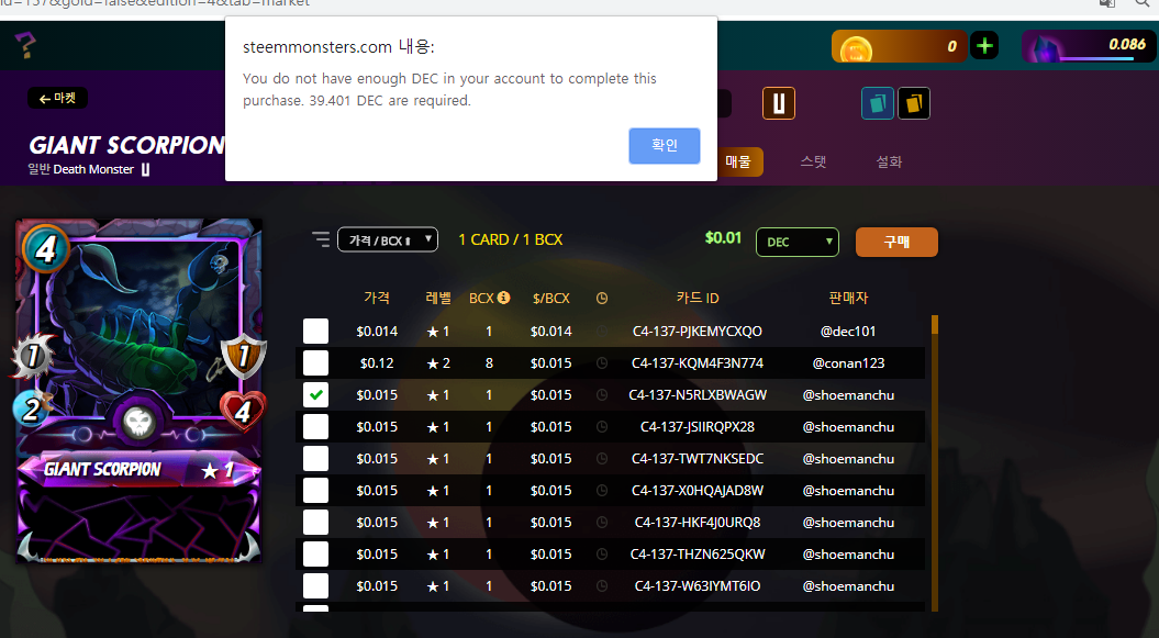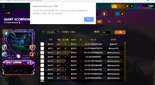 제일 싼 카드도 39 DEC 정도 하던데, 이래서야 게임해서 카드 살수나 있을지...