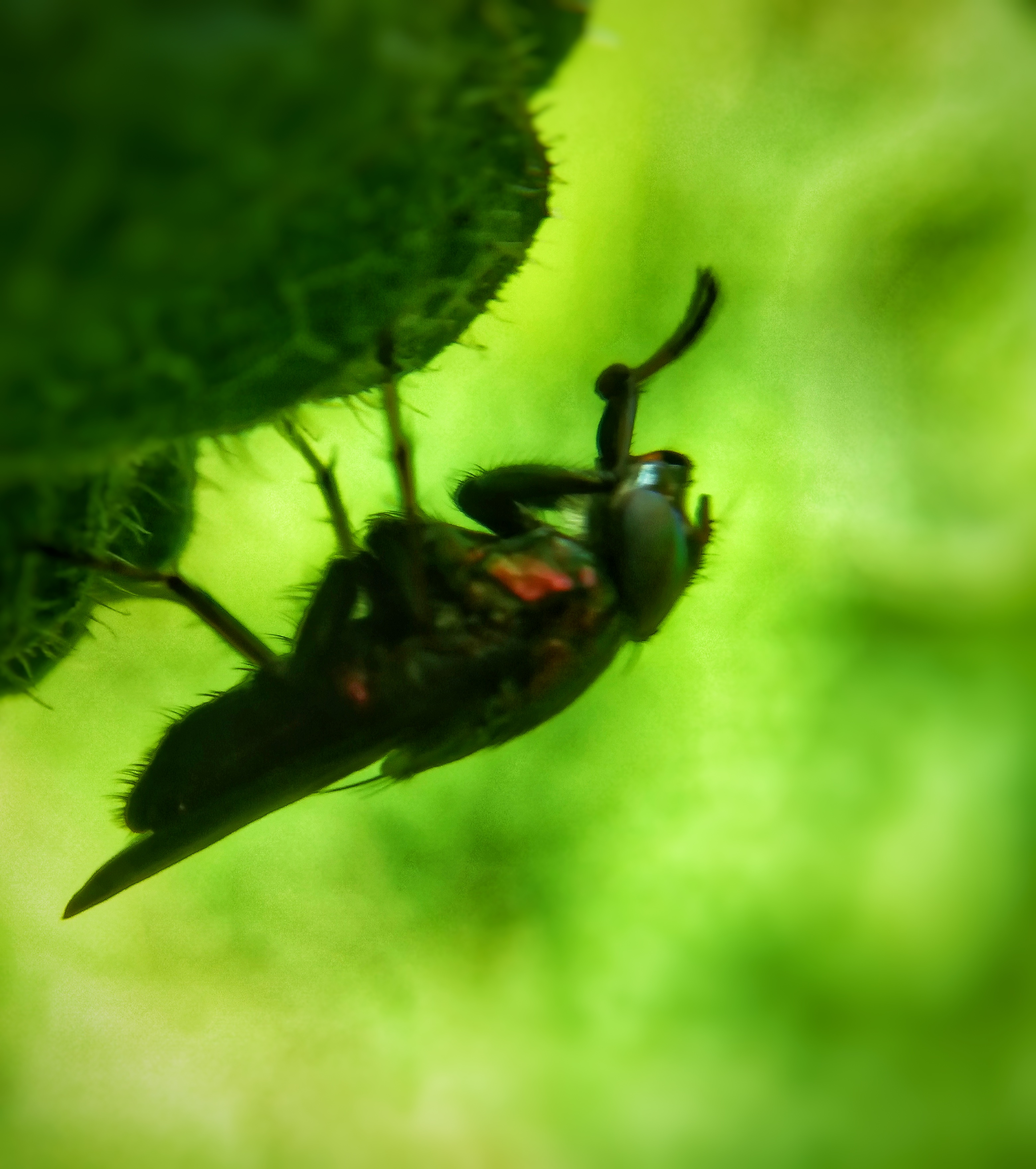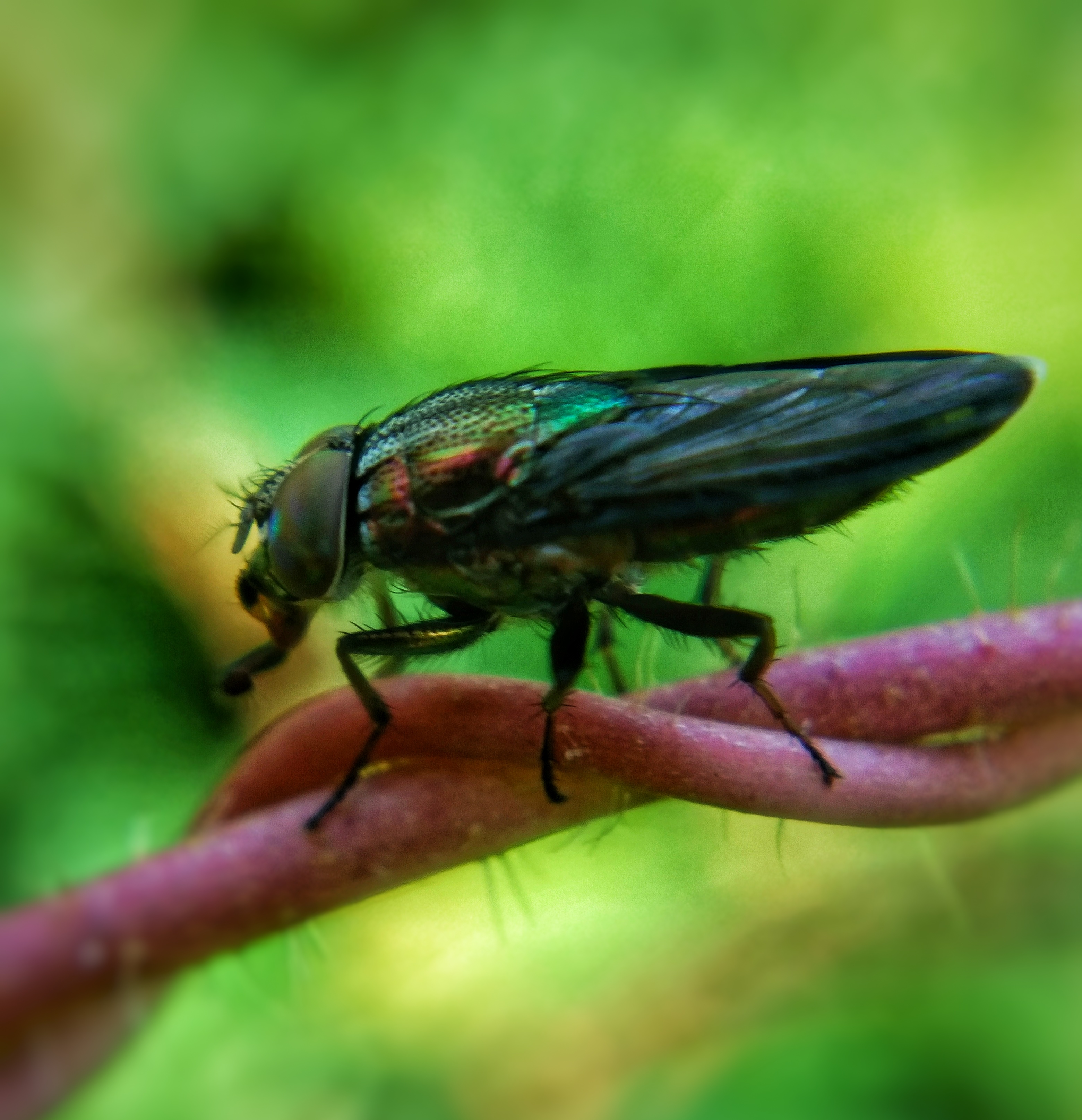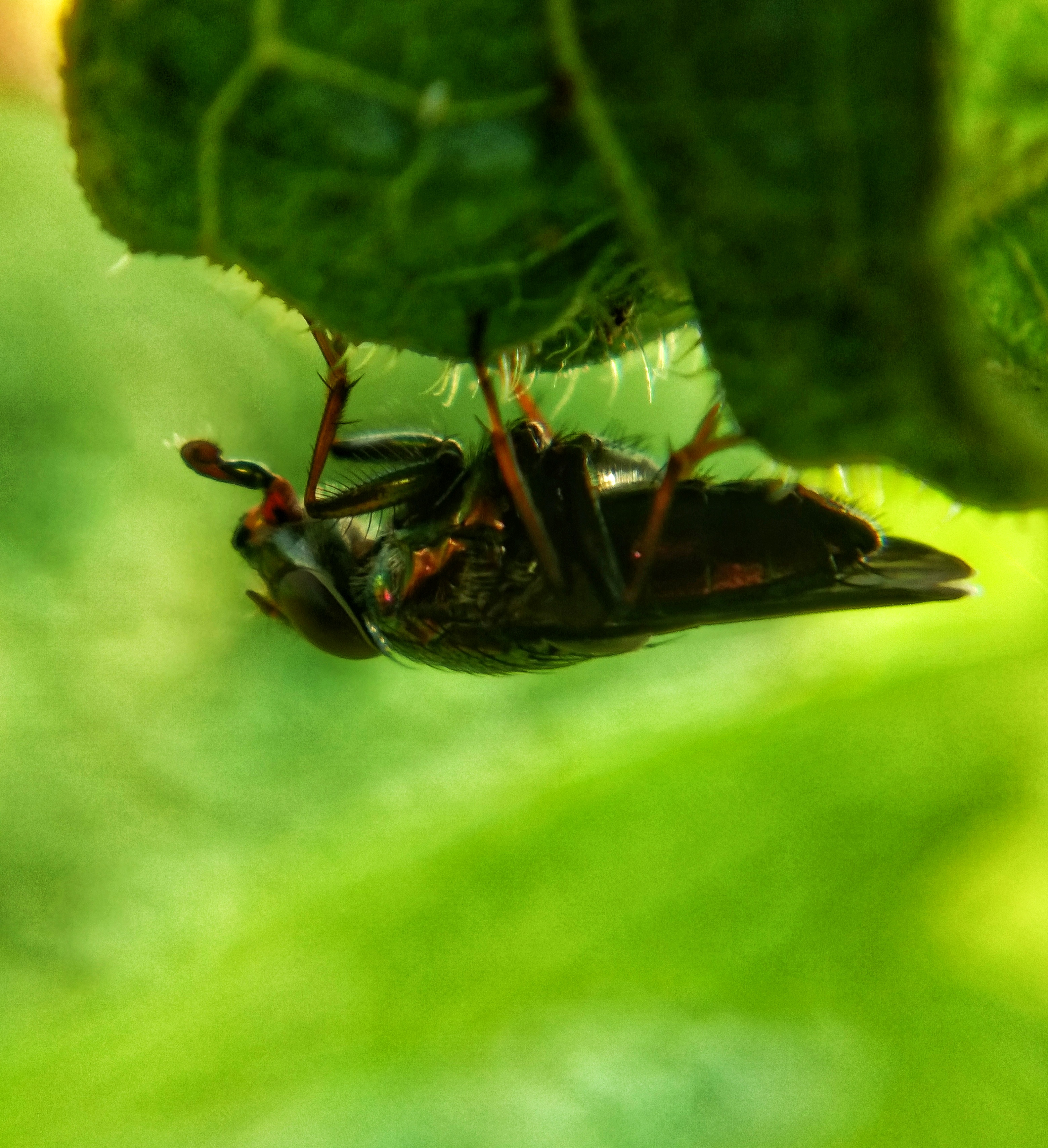Today I saw an insect that resembles a fly, or indeed this is a fly. I don't know for sure, I found him in the forest behind the house, standing on a leaf. I had time to take a few sheets of the picture before he flew and disappeared.
