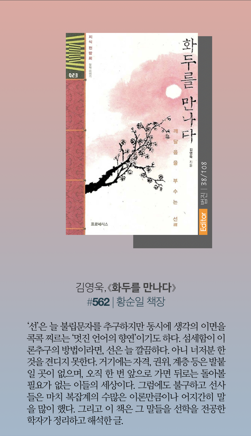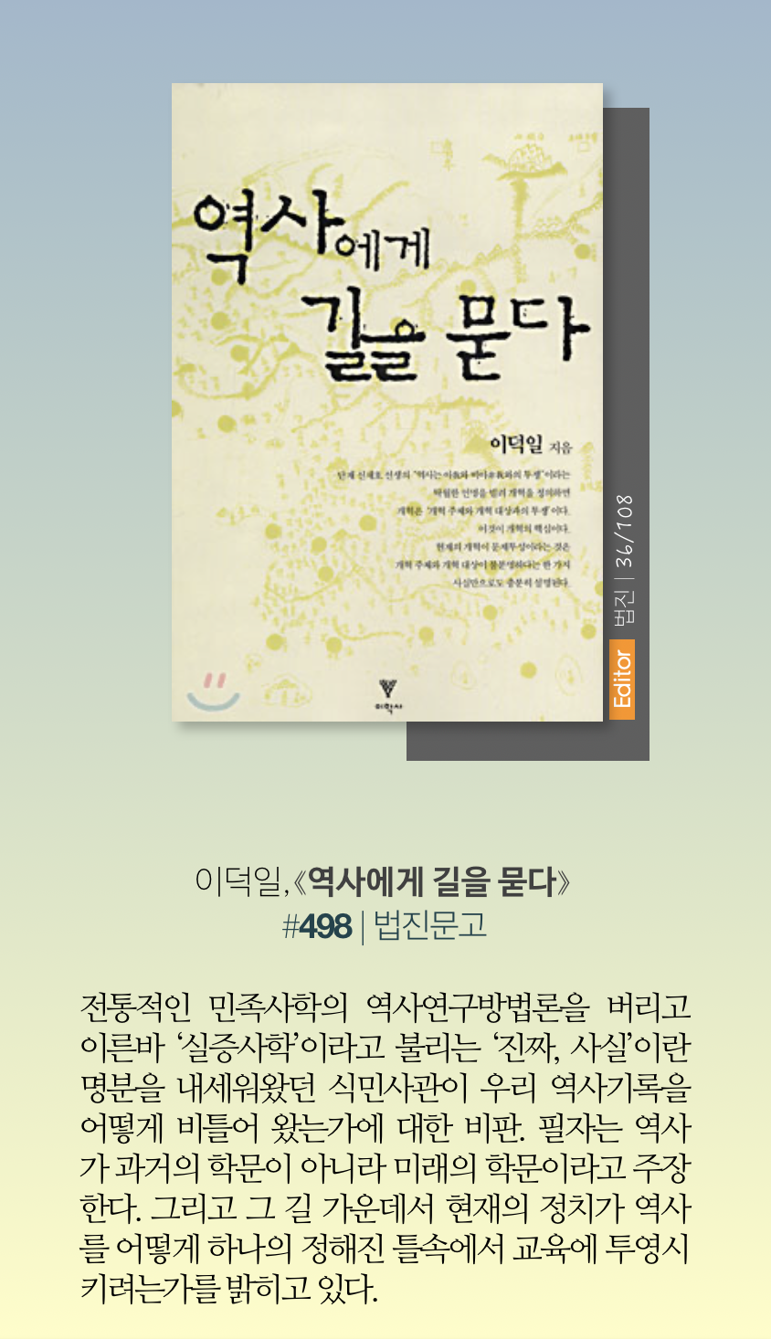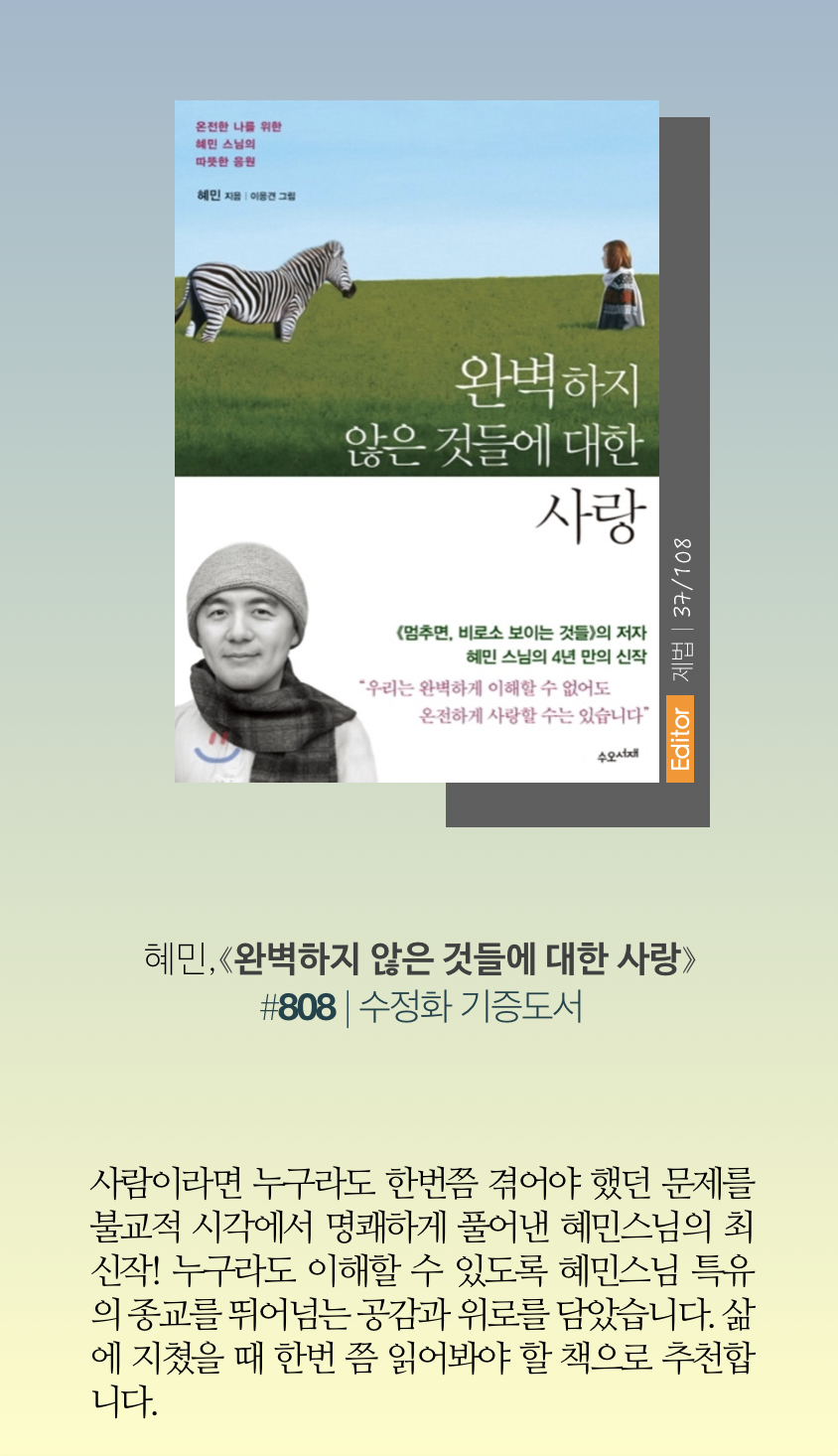 @ybc는 이전에 기획했다가 마무리 하지 못했던 108도서 리뷰를 재개하고 있습니다. 스마트폰 판형으로 바꾸고 며칠전부터 매일 커뮤니티 단톡에 연재를 시작했습니다. 스팀잇에는 매 10개마다 포스팅 하는 방식으로 약 10여차례에 걸쳐서 정리해두려고 합니다.