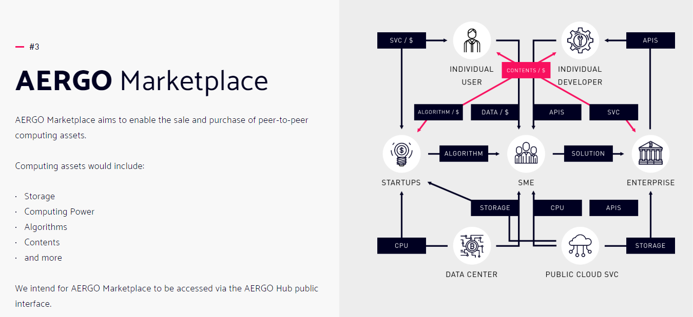 AERGO MARKETPLACE je jediným servisom pre softvérové aplikácie, výpočtové zdroje a ďalšie služby optimalizované pre sieť AERGO. Prístup na trh Aergo bude poskytovaný prostredníctvom verejného rozhrania Aergo Hub.