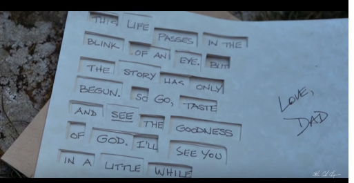 " 이 삶을 눈 깜짝할 사이에 지나가버린단다. 하지만 그건 시작일 뿐이란다. 그럼 가서 하나님의 선하심을 맛보고 이해해가거라. 잠시 뒤에 만날 수 있을 거야. 사랑한다. 아빠가.."