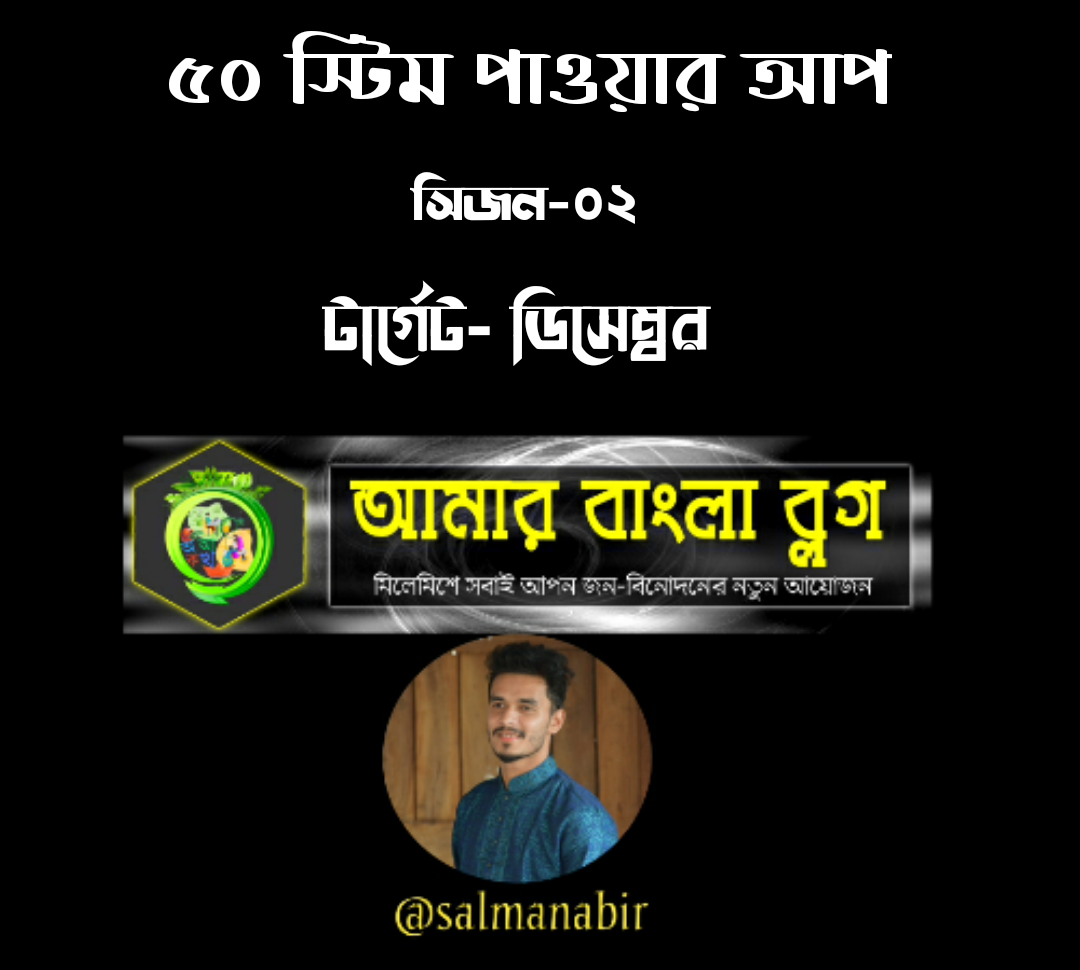 আশা করছি আপনারা সবাই অনেক ভাল আছেন। আলহামদুলিল্লাহ আমিও ভালো আছি। আজকে আমি আপনাদের মাঝে একটি পাওয়ার আপ পোস্ট নিয়ে হাজির হয়েছি। কিছুদিন আগেই আমাদের টার্গেট ডিসেম্বর সিজন -১ শেষ হলো। এখন বর্তমানে টার্গেট ডিসেম্বর সিজন-২ চালু । আমি আজকে টার্গেট ডিসেম্বর পাওয়ার আপ সিজন ২তে ৫০ স্টিম পাওয়ার আপ করে অংশগ্রহণ করতে যাচ্ছি।