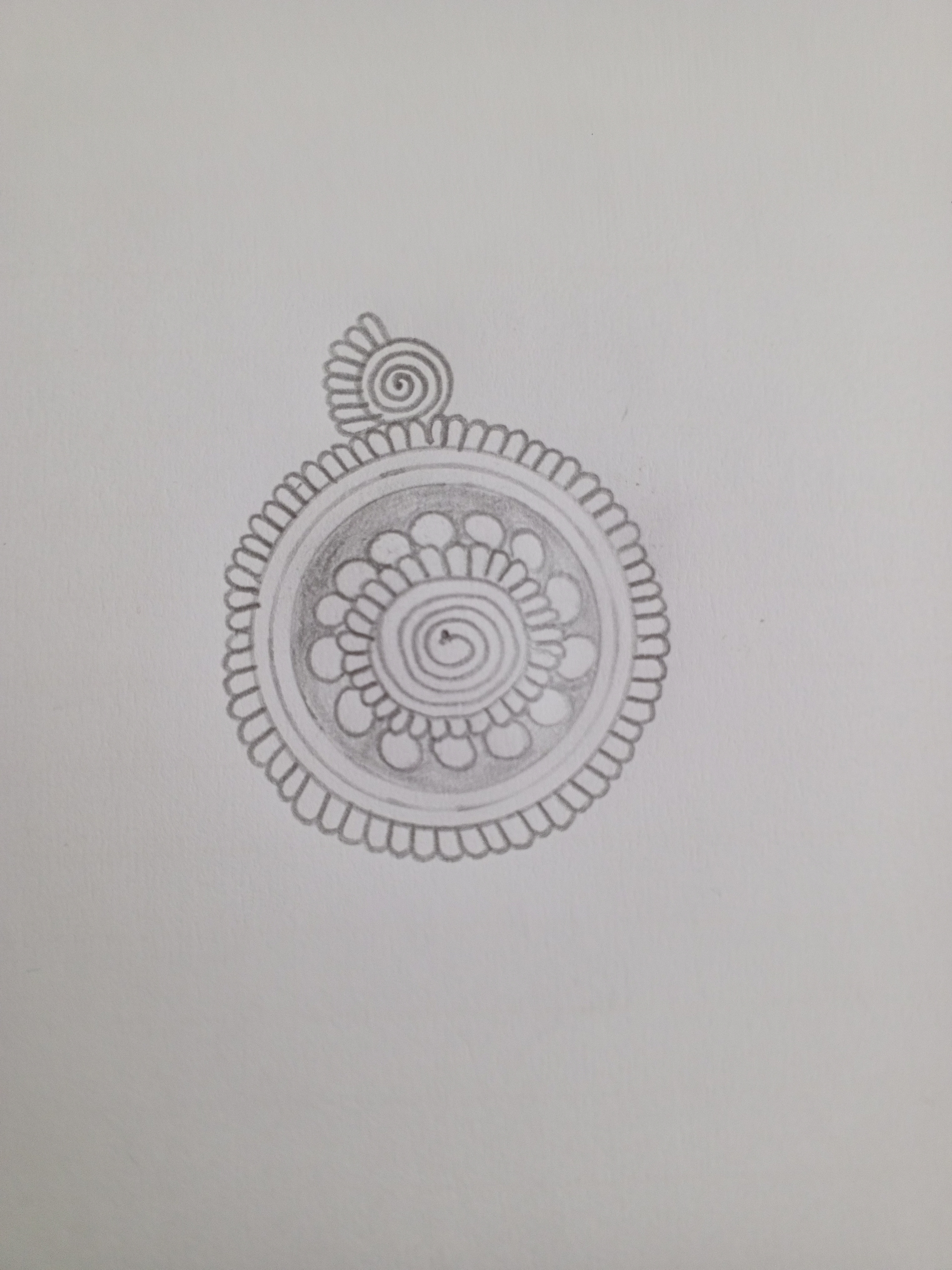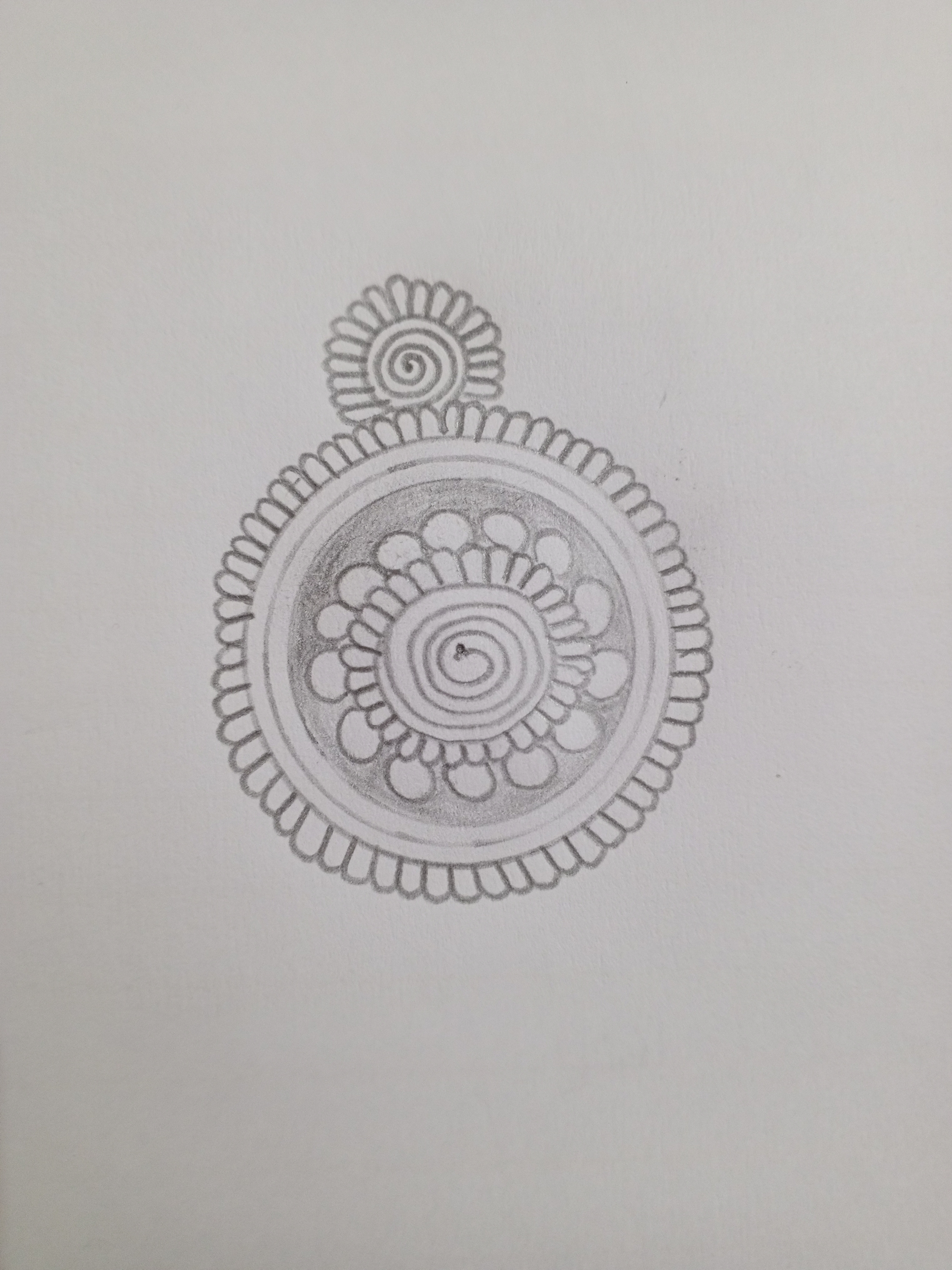 উল্টা এক ও ঠ আকৃতির ডিজাইনকে কেন্দ্র করে একটি অর্ধেক বৃত্ত এঁকে নিয়েছি। আর বৃত্তের মাঝখানে কয়েল আকৃতির ডিজাইন করে নিয়েছি।