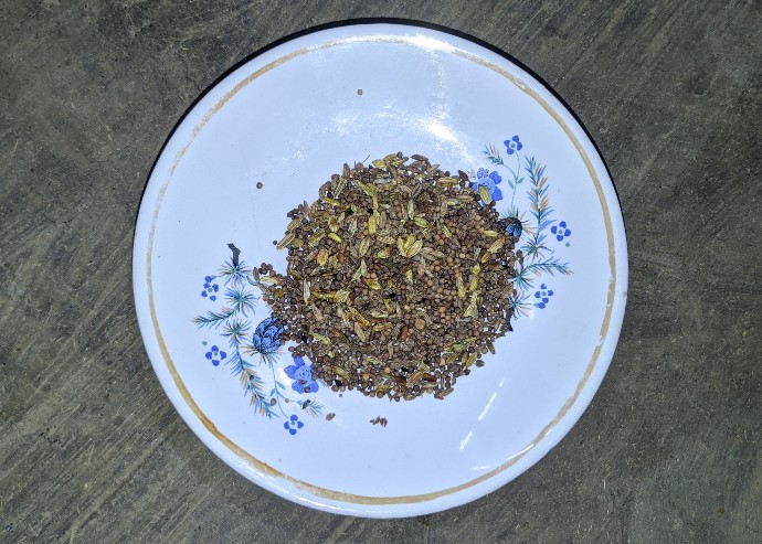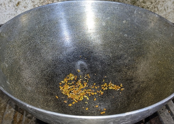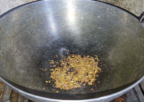 - কড়াই ভালো ভাবে তেতে যাওয়ার পর মৌরি, অজবায়ন ও গোটা সাদা সর্ষে কড়াইতে দিয়ে ভাজতে শুরু করলাম। মশলা গুলো হালকা ভেজে একটা প্লেটে তুলে রাখলাম।