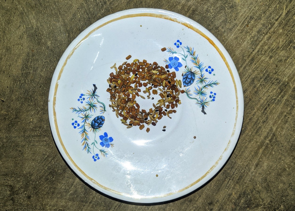 - মৌরি, অজবায়ন ও সাদা সর্ষে ভাজা হয়ে যাওয়ার পর গোটা মেথি গুলোকেও একই ভাবে শুকনো ভাবে ভেজে নিলাম।
