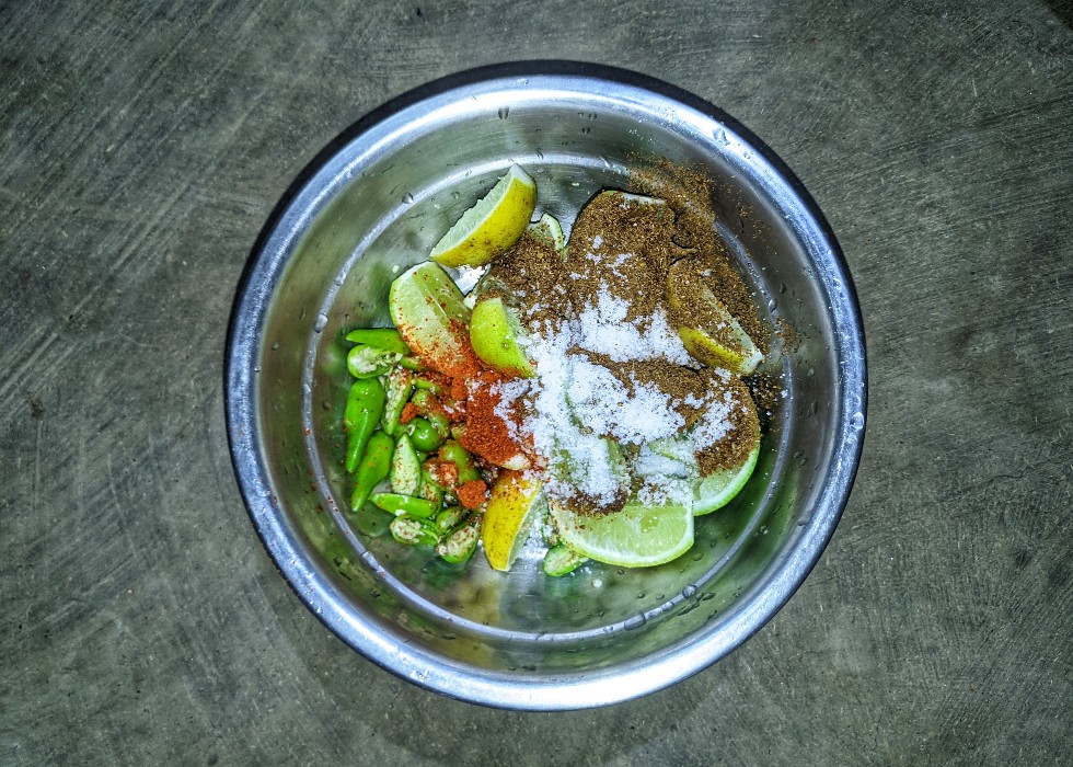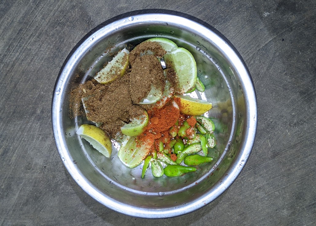 - বাটা মশলা গুলো এক এক করে কেটে রাখা লেবু ও লঙ্কার উপরে ছড়িয়ে তারপর স্বাদমতো নুন দিয়ে সব কিছু মাখতে শুরু করে দেবো।
