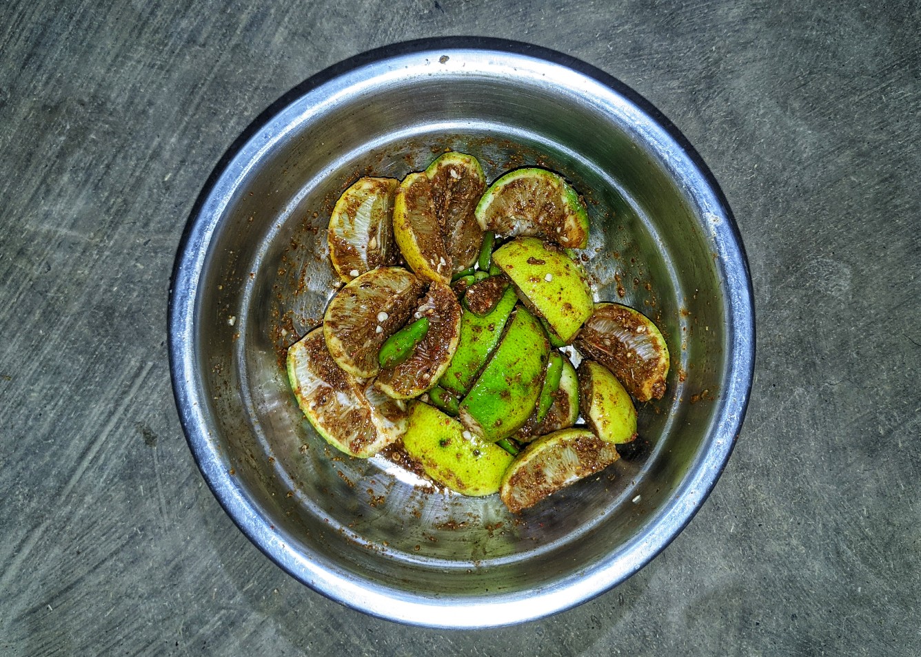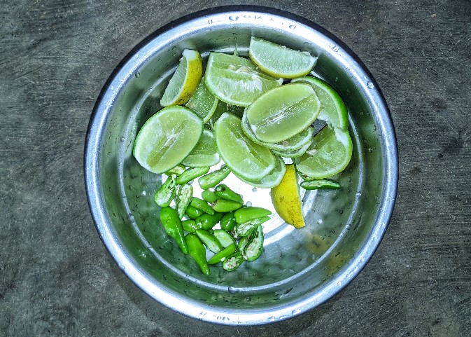 - লেবু তিন ফালি করে এবং লঙ্কা গুলো দু ফালি করে কেটে বাটিতে রেখে একটা পাত্র দিয়ে চাপা দিয়ে রাখলাম। (এই ধাপ টা মা করে দিয়েছে) 😛।