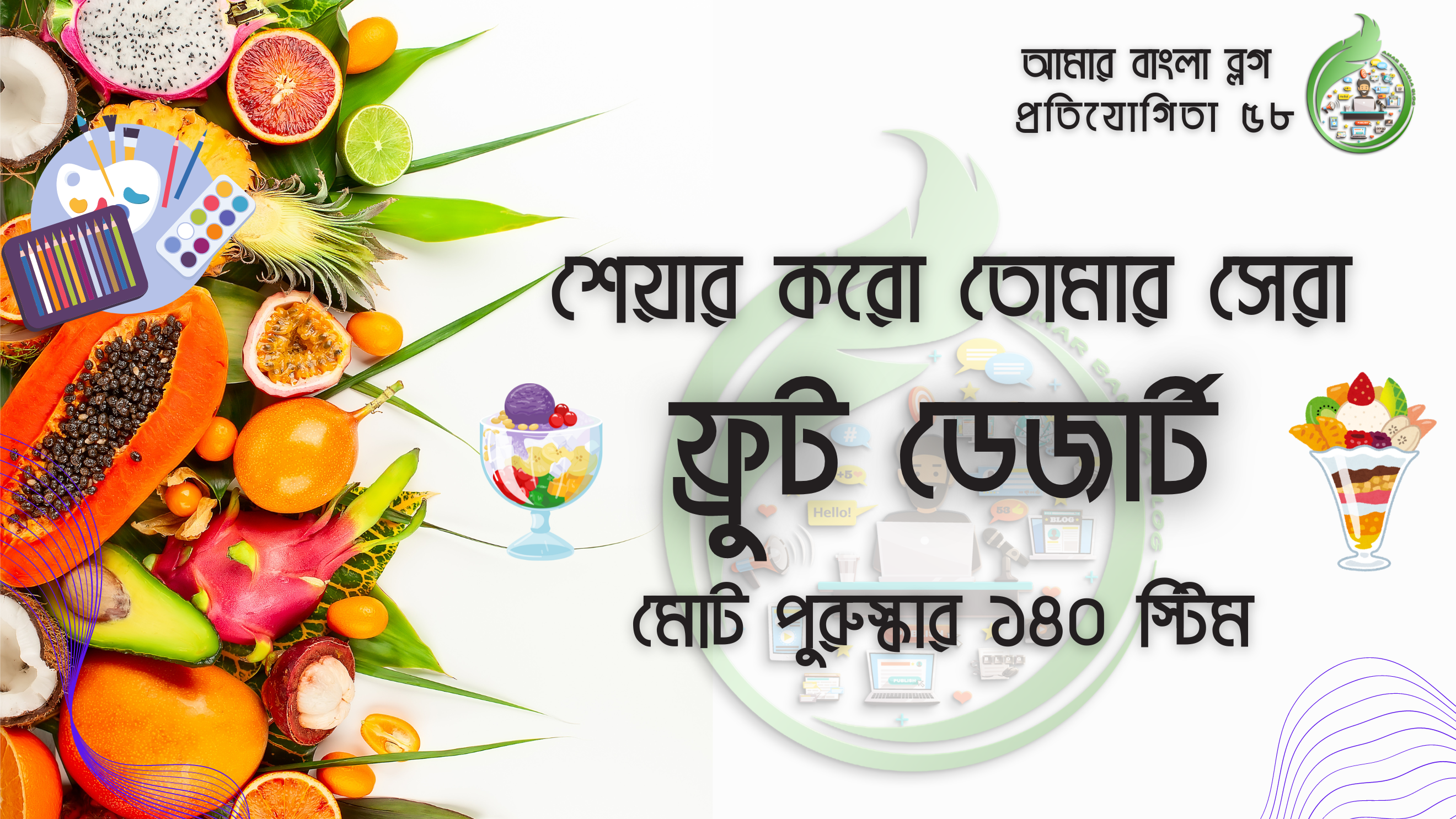 আমার পোস্টের ব্যানার দেখে আপনারা নিশ্চই কিছুটা হলেও ধারণা করতে পেরেছেন আমাদের প্রতিযোগিতার বিষয়বস্তু। গরমের কারণে গ্রীষ্মকালের দুর্নাম থাকলেও একটি বিশেষ কারণে গ্রীষ্মের সুনামও রয়েছে, তা হলো ফল। আসলে গ্রীষ্ম যেমন ভাবে সাথে করে গরম বয়ে নিয়ে আসে তেমনি বয়ে নিয়ে আসে নানান রকমের ফল। আম, কাঁঠাল, তরমুজ, লিচু, বাঙ্গি থেকে শুরু আরো নানা ফল এই সময়ে প্রচুর পরিমাণে পাওয়া যায়, স্বাদ গ্রহণ করা যায়। অনেকের বাড়িতে আম, কাঁঠাল বা লিচু গাছই রয়েছে তারা তো সুযোগ পেলে গাছ থেকেই টপাটপ পেড়ে ফেলে। তবে যাদের বাড়িতে ফলের গাছ নেই তারাও আমের আস্বাদন বা লিচুর সুবাস কোনো কিছুই বাদ দেন না। গ্রীষ্মের ফলের সম্ভার তুলে ধরার সুযোগ করে দিতে আমার বাংলা ব্লগ -এর ৫৮ তম প্রতিযোগিতার বিষয় হিসেবে বেছে নেওয়া হয়েছে, ফ্রুট ডেজার্ট। ফল দিয়ে বানিয়ে ফেলুন আপনার পছন্দের ডেজার্ট। যার স্বাদ আপনার পরিবারের মানুষ জন নেবেই তার সাথে আমরাও নতুন নতুন ডেজার্ট দেখতে পাবো।