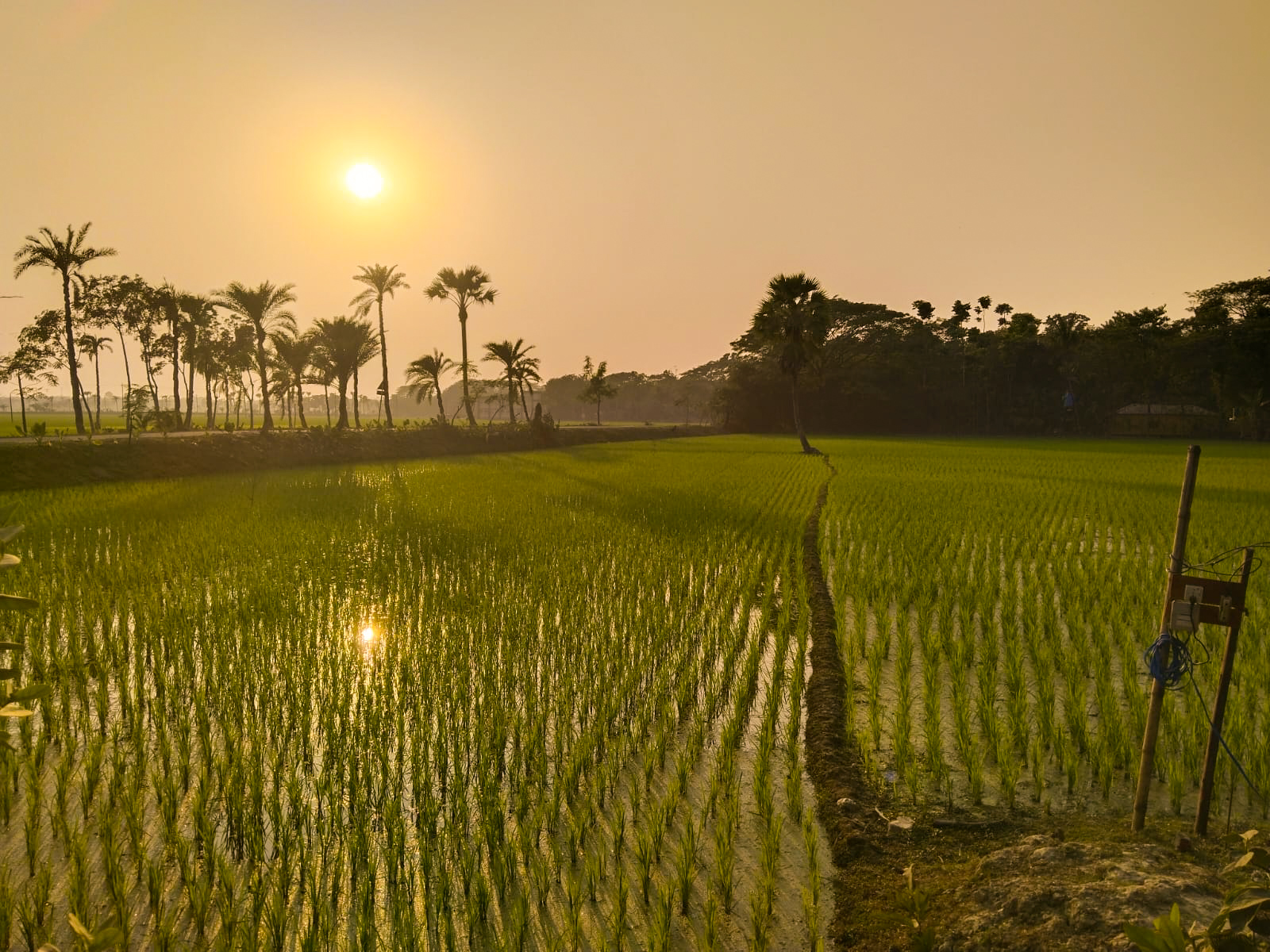 আপনারা এখন যে ফটোগ্রাফিটি দেখছেন এটি হচ্ছে বাংলাদেশের অন্যতম একটি কৃষি প্রধান ফসল। আর তা হল ধানের চারা। সকালে ঘুম থেকে যখন উঠে খালাদের ফসলের ক্ষেতে হাঁটতে গিয়েছিলাম তখন এই দৃশ্যগুলো দেখে আমি মুগ্ধ হয়ে গিয়েছি। আরে ফটোগ্রাফি গুলো দেখে এতই মুগ্ধ হয়ে গেছি যে আপনাদের মাঝে শেয়ার করব বলে ফটোগ্রাফি করে নিলাম। সকালে যখন প্রথম সূর্য উঠছে তখন সূর্যের কিরণে ধান ক্ষেতের চারিদিক আলোকিত করে আলোয় আলোয় ভরিয়ে ধানক্ষেতের সৌন্দর্য আরো বৃদ্ধি করে তুলেছে। সেই সূর্যের ☀️ আলোর কিরণ ধানের চারার মাঝে যখন পড়েছে তখন তখন দুটি সূর্য যেন স্পর্শ হয়ে আলোটিকে আরো ঝলমল করে চারিদিক আকর্ষণ করে তুলেছে আর এই দৃশ্যটি অপূর্ব লাগছিল আর এত সুন্দর দৃশ্যটি ফটোগ্রাফি না করার লোভ সামলাতে পারছিলাম না আশা করছি আপনাদের হৃদয়ও আমার এই ফটোগ্রাফি কিছুটা হলেও দোলা দেবে।