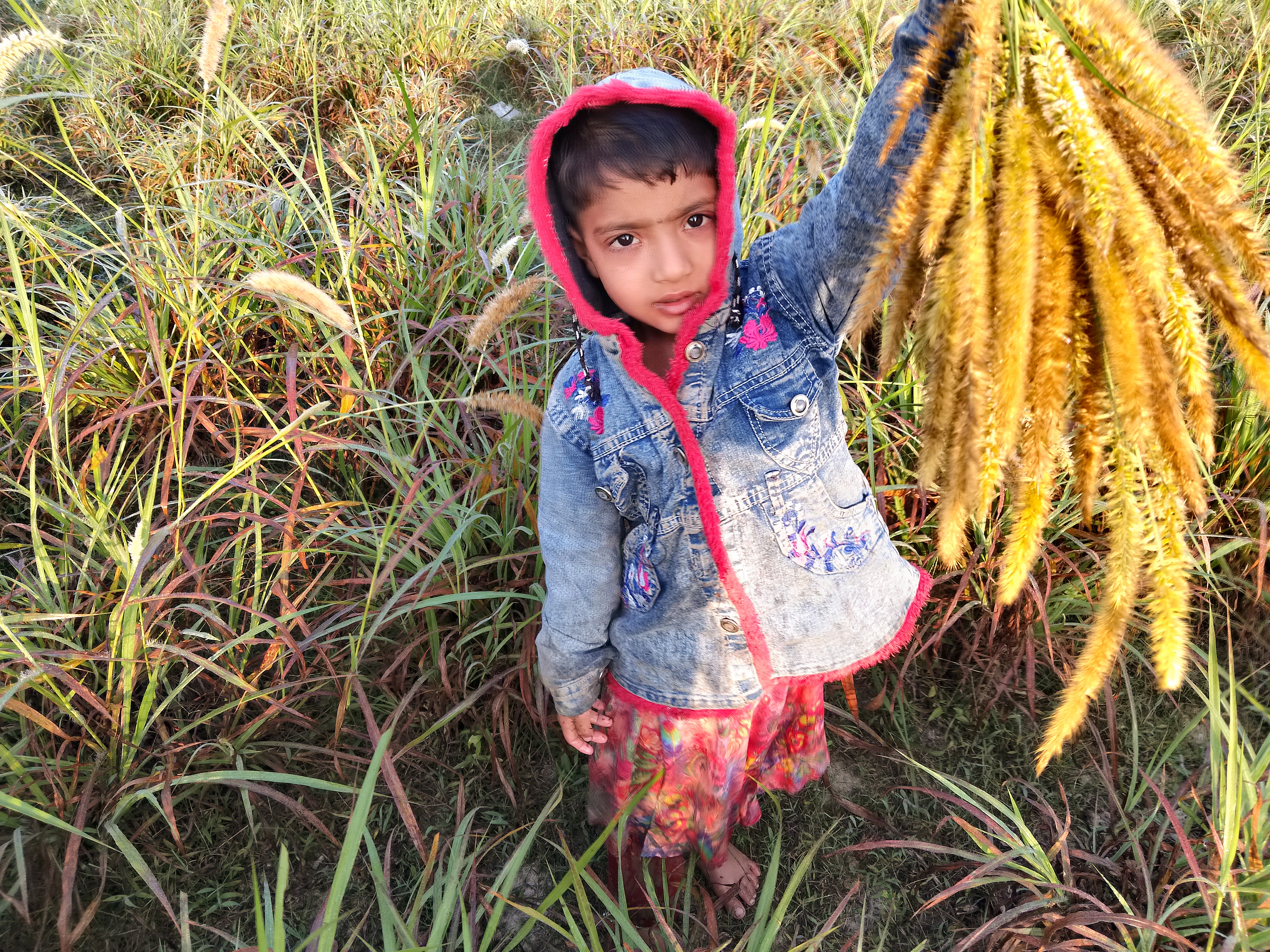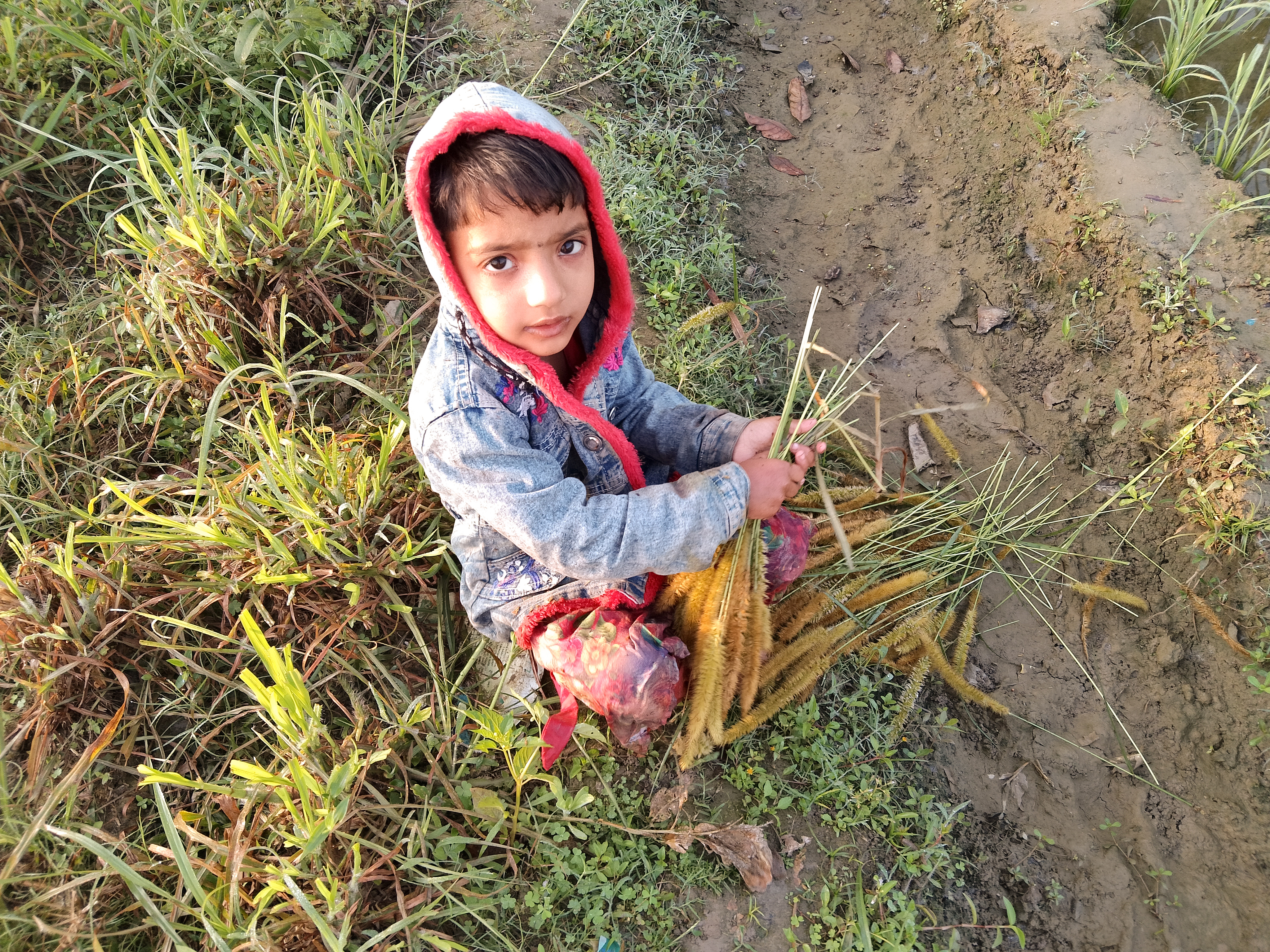 এবার আমি একটি সুন্দর ফটোগ্রাফি নিয়ে আপনাদের মাঝে হাজির হয়েছি এই ফটোগ্রাফি টা আমার কাছে বেশ ভালো লেগেছে। ফসলের গুলোতে যে ধান ও বিভিন্ন সবজি চাষ করে তা কিন্তু নয় এখানে কিন্তু আবাদি গরু ছাগলের জন্য খাবারও চাষ করা হয়। এই ঘাস গুলো কি আমি চিনি না ও আমাকে বলছিল এগুলো তুলে দিতে এগুলো নাকি খাবে কিন্তু কে খাবে সেটা বুঝতে পারিনি আমি মনে করেছি এগুলো হয়তো কোন ভাবে রান্না করে খাওয়া যায়। আর আমাকে বলছিল অনেকগুলো তুলে দিতে। এখন এই কুয়াশা শিশিরে ভেজা কাদা কাদা মাঠে কিভাবে কিভাবে তুলে দিব কিন্তু ও নাছো র বান্দা কথা শুনছিল না আর ওকে ছাড়া তো আমি বাসায়ও চিনব না তাই কি আর করার ওকে কতগুলো ফুল তুলে দিলাম। ও এতোটুকু বাচ্চা এতটুকু হাতে আমার থেকেও বেশি তুলে নিল আর সুন্দর করে ফুলগুলো গুছিয়ে নিল দেখেন এতটুকু কচি হাতে কিভাবে কতগুলো ফুল এক হাতে ধরে রেখেছে আমি তো দেখে পুরোটাই অবাক হয়ে মুগ্ধ চোখে তাকিয়ে ছিলাম ওর দিকে।