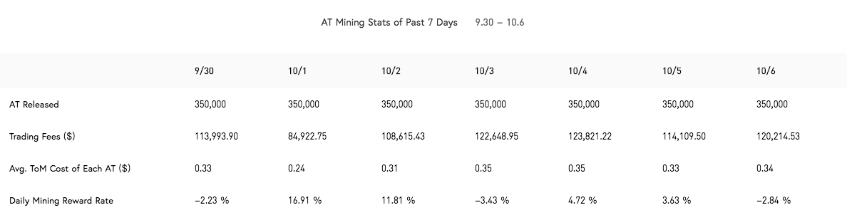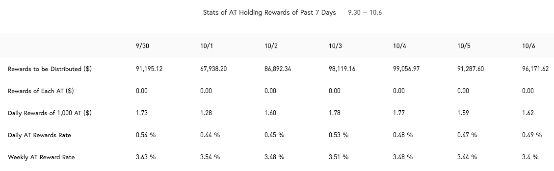 So it turns out that if you have AT tokens on the balance, you get a percentage of the exchange’s earnings for that day. According to statistics for the last couple of days, it turns out ~ 0.5% of your deposit !!!