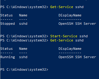 - Start-Service sshd. Now it is started, if you want to stop: Stop-Service sshd.
