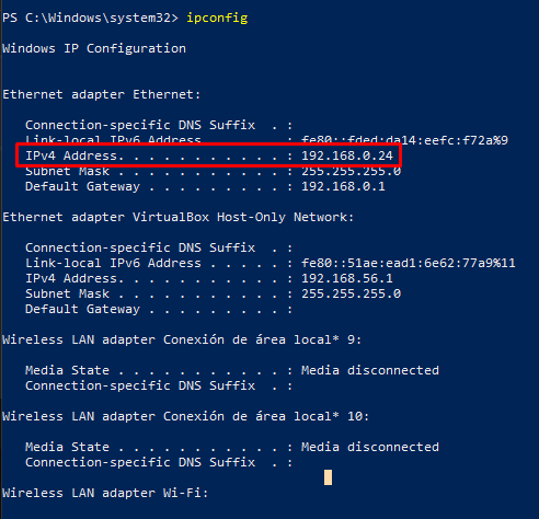For example, from Linux to Windows first you have to check your IP in Windows with the ipconfig command: