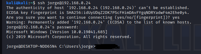 Now type in the Kali´s shell: ssh jorge@192.168.0.24